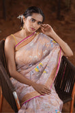 This pastel pink zari Kota Jamdani silk sari comes with an intricate silver and gold zari jaal leaf design. The sari features a rustic Copper kaddi border and bird motifs in its body.