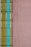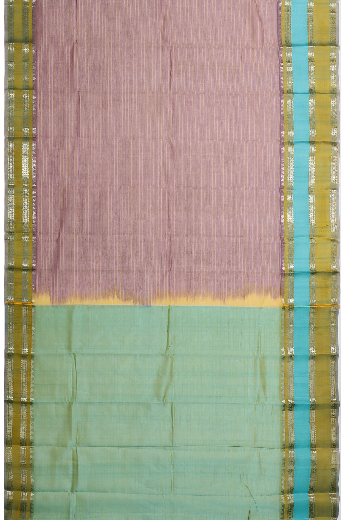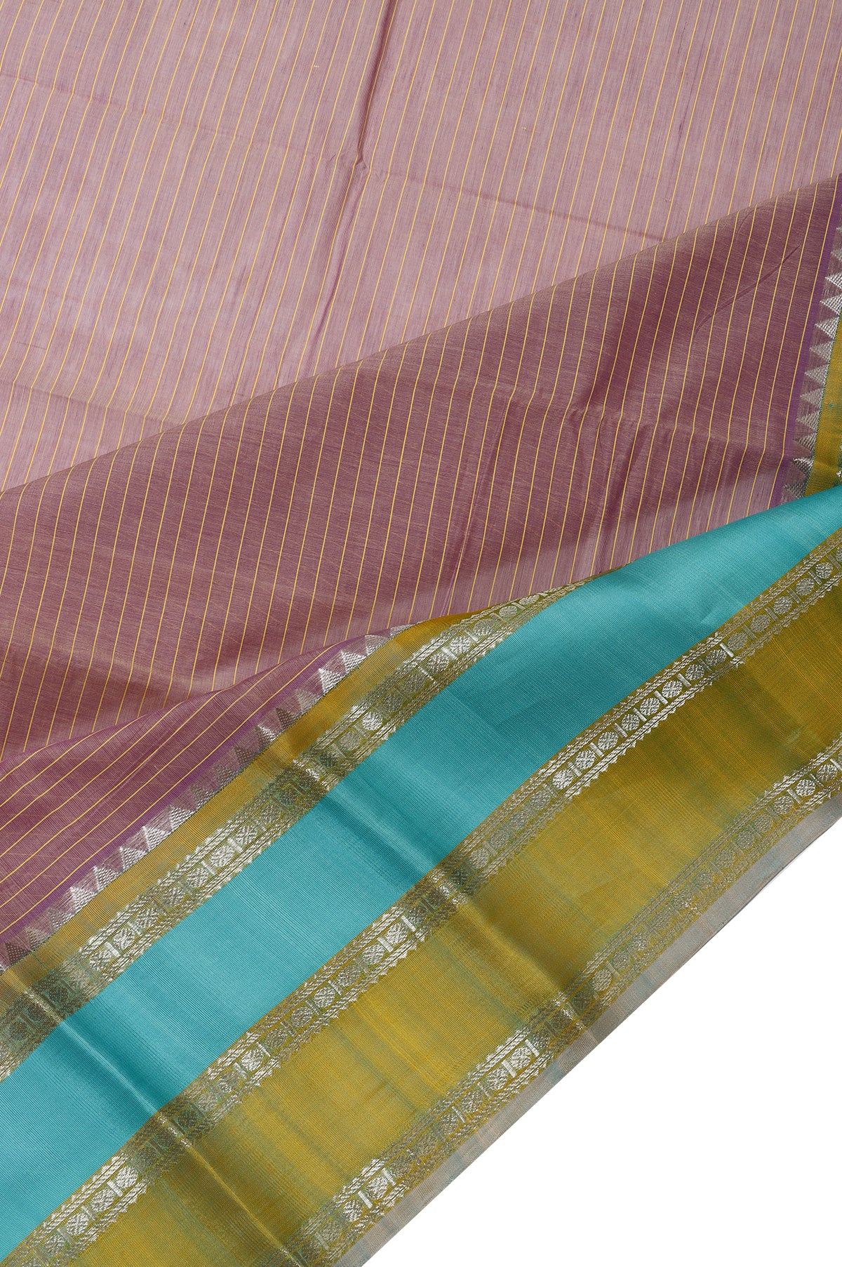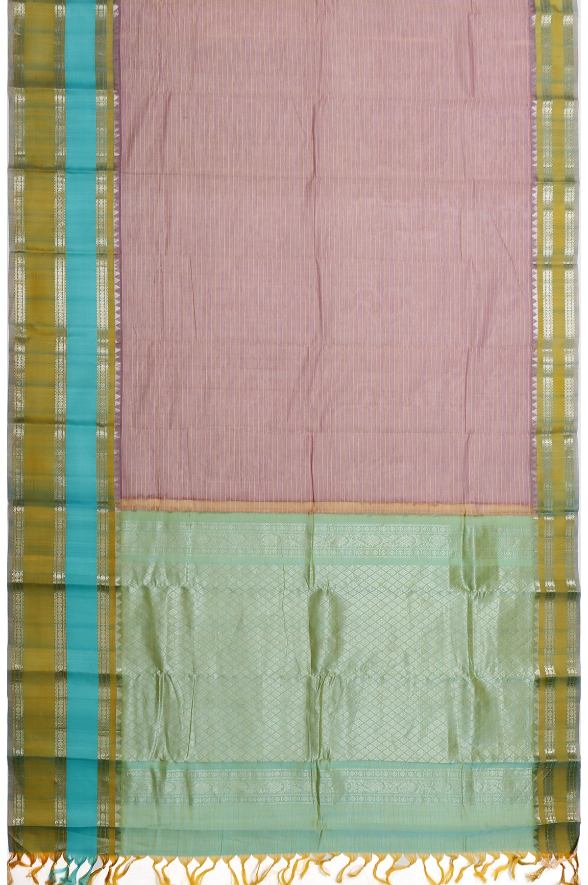 Elegant and unique, this Lavender Kanchi Kora Silk Saree is adorned with delicate yellow stripes over a soft self background. The light green border, detailed with silver zari, rudraksha buttas, and a blue plain stripe, adds a graceful contrast. Its pallu showcases intricate silver zari yanai, kili motifs, mango buttas, and kaddi stripes with tassels. Paired with a light green plain blouse with border for a refined traditional look.