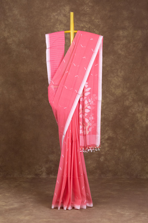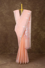 Draped in this 6-yard blessing, you are sure to be a head-turner. This artistically crafted peach Bengal Cotton Saree becomes your proud possession. It is elegantly ornamented with thread butta. The beige colour border brings forth very subtle beauty as the contrast is not overly emphasised. The jamdani work, tree motifs, stripes and tassels of the pallu need a special mention.