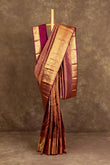 Flaunt your style in this maroon silk saree with self-colored kaddi-bordered saree with gold zari rudraksha butta, leaf design, and flower butta. The self-colored pallu boasts a matching design with multi-design lines, while the brocade body design showcases brocade mango motifs.