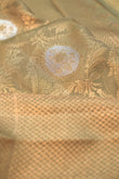 Enhance your traditional wardrobe with this Mehendi Green Kanchipuram silk saree, featuring intricate gold and silver zari jaal with delicate motifs on the body. The self-colored border and pallu are adorned with checks, leaf designs, and flower buttas. Comes with a matching blouse, perfect for weddings, festive occasions, and cultural celebrations.