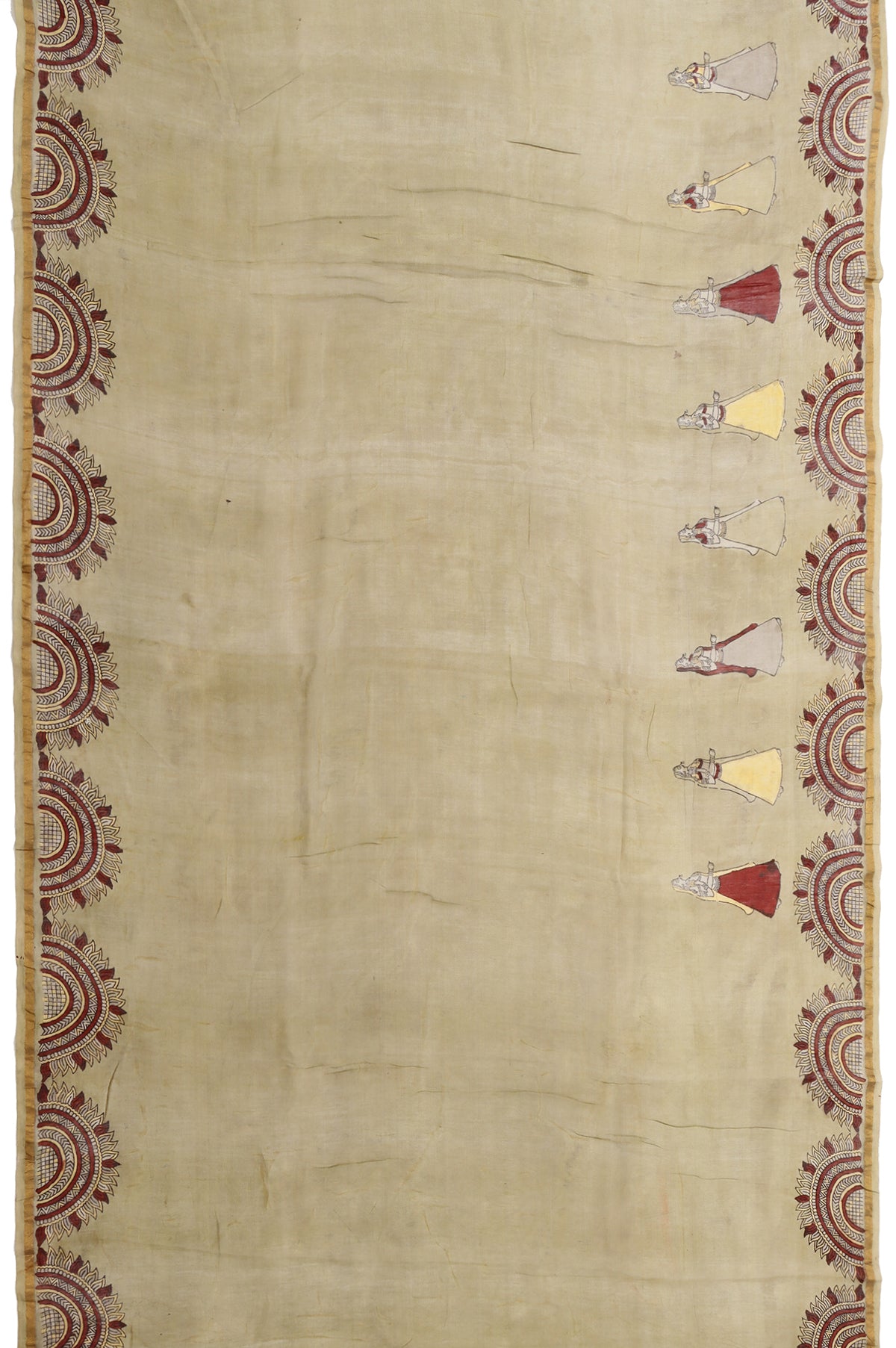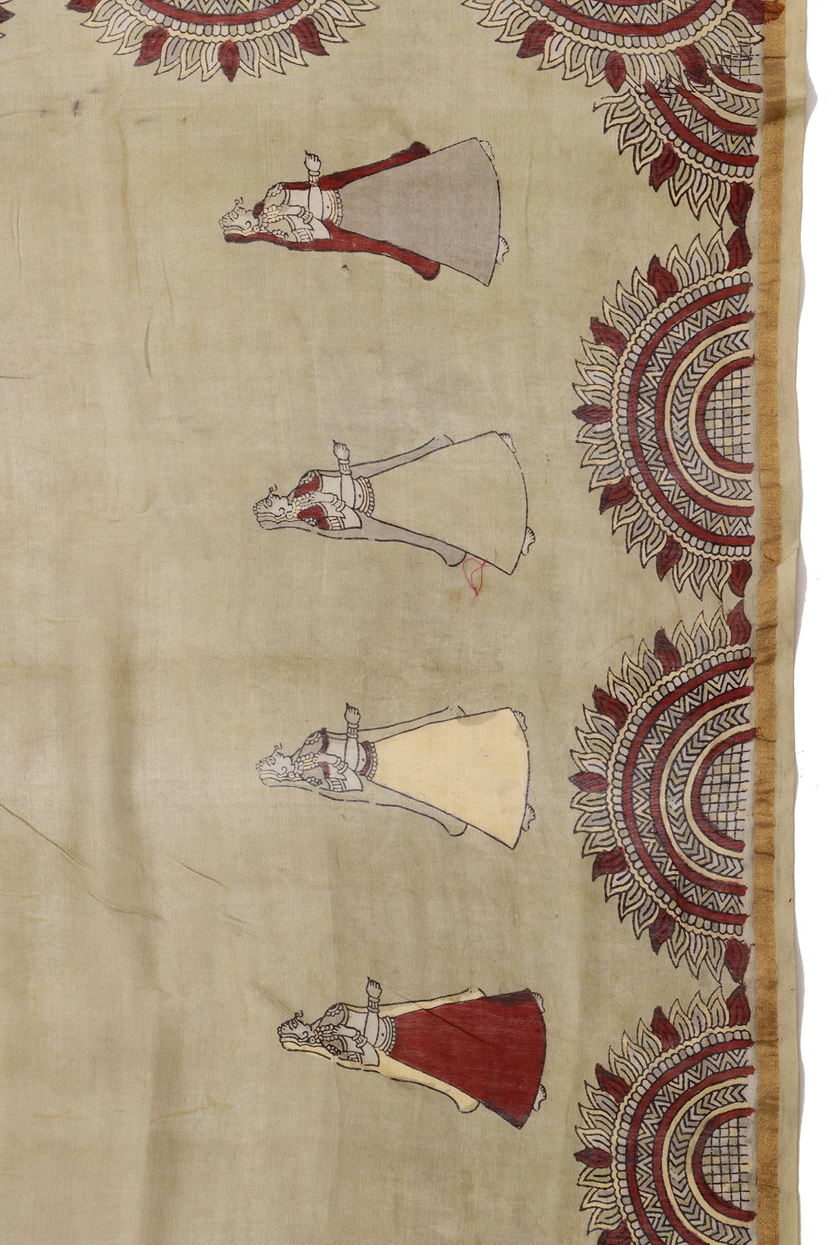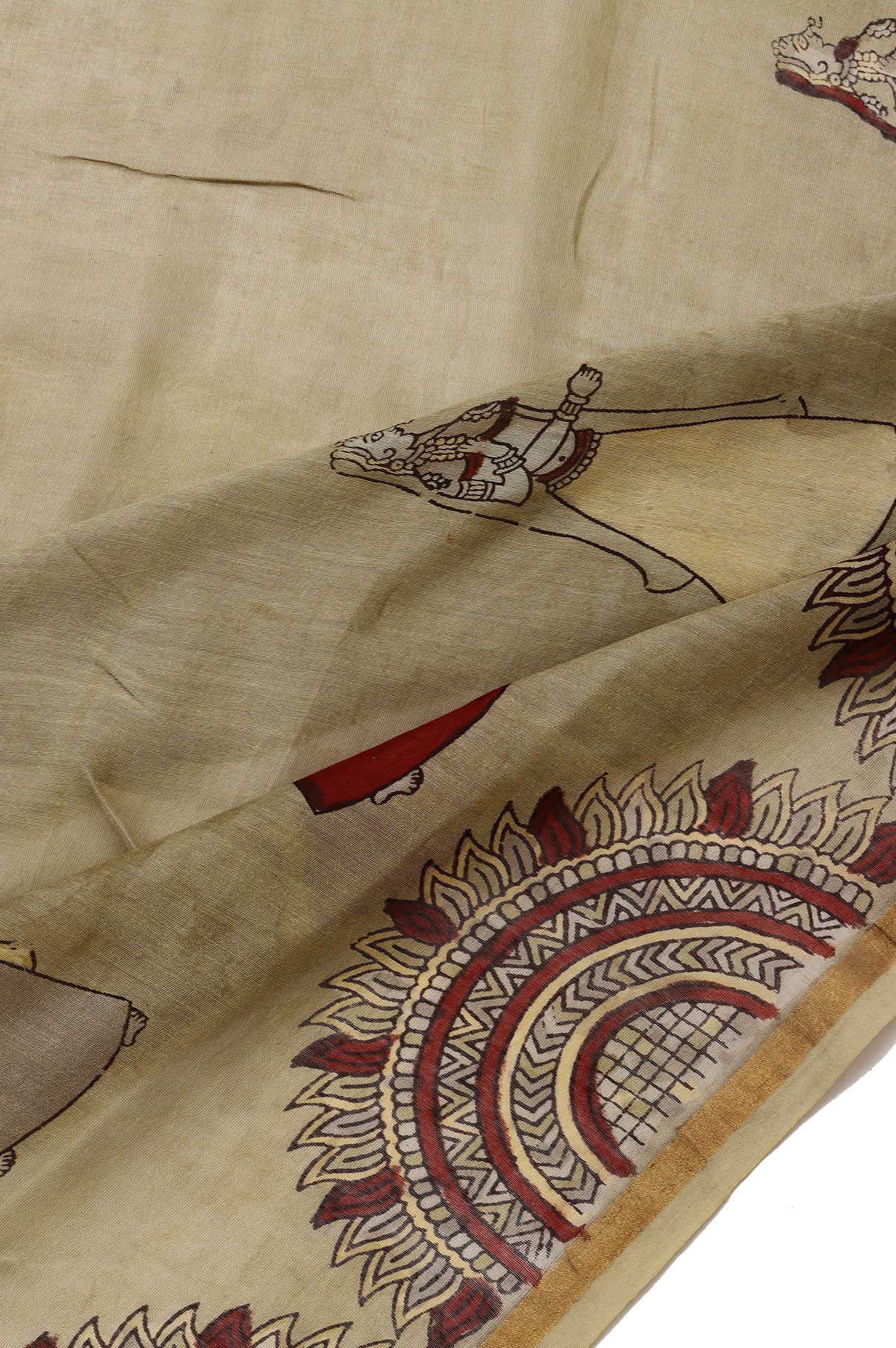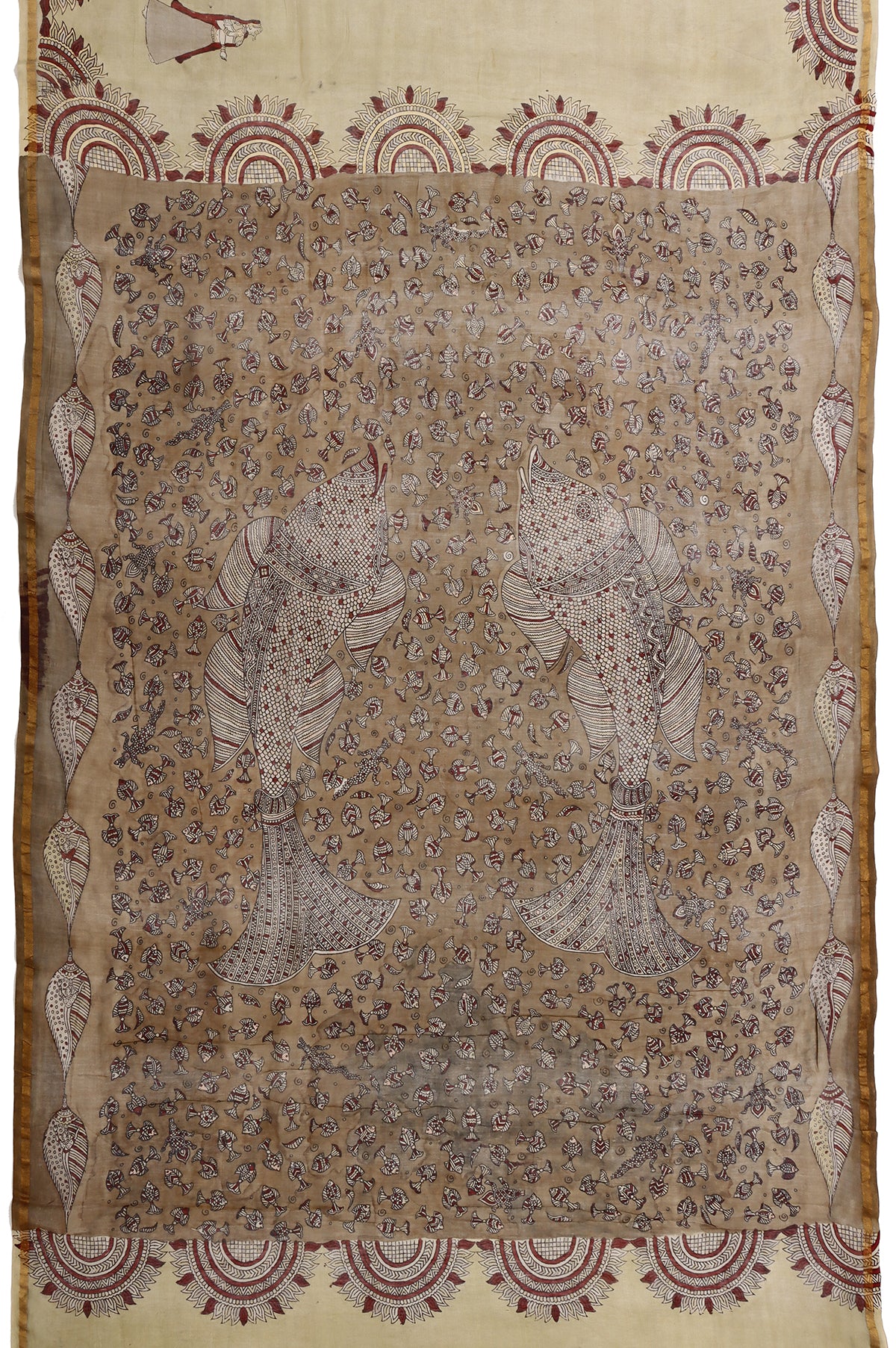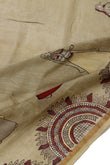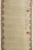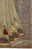 Artistic and earthy, this Mehendi Green Mata Ni Pachedi Saree features a plain, graceful body that highlights the beauty of traditional craftsmanship. The self-coloured border is enriched with a classic gold zari kaddi weave and intricate hand-painted designs. Its Beige pallu becomes the focal point with beautifully hand-painted fish motifs, celebrating folk artistry. Paired with a plain blouse and matching border, perfect for cultural occasions and understated elegance.