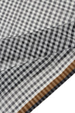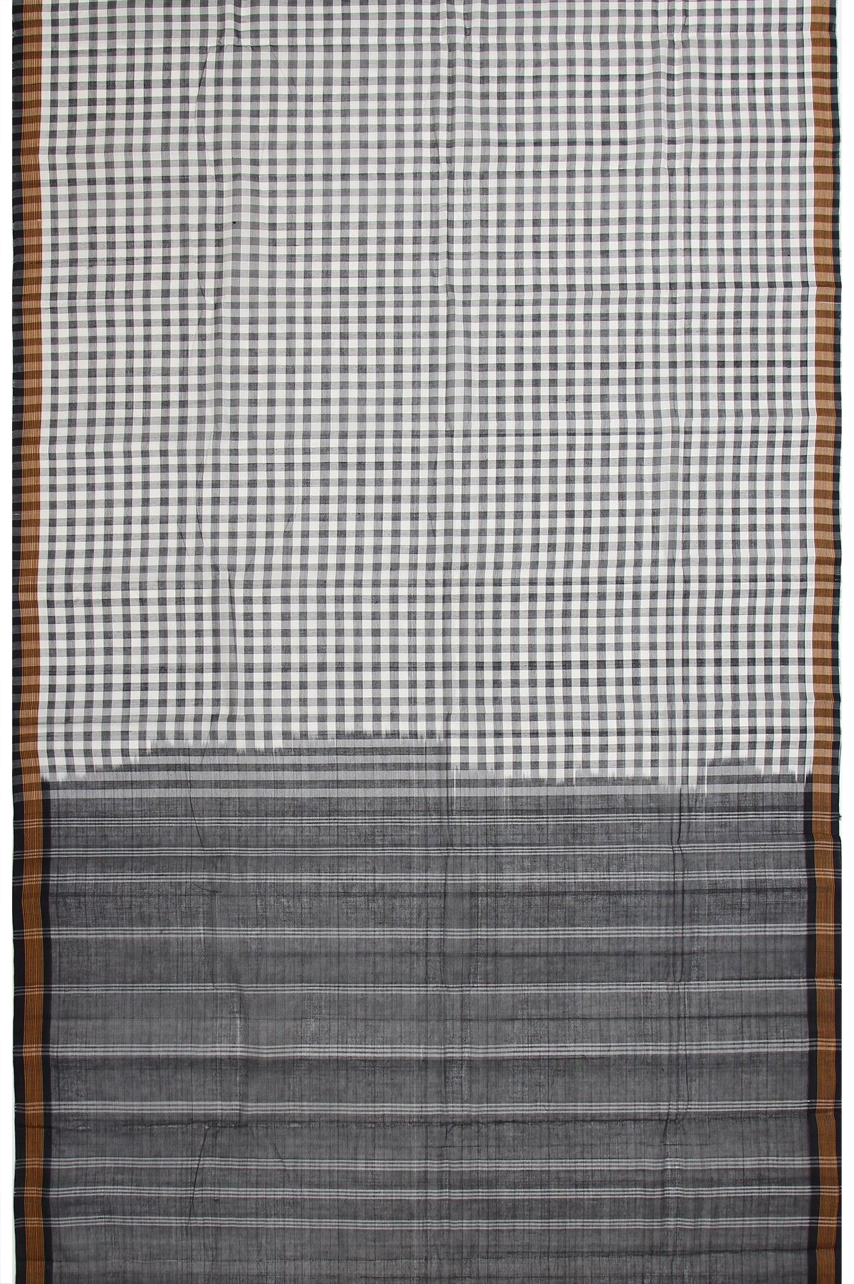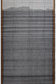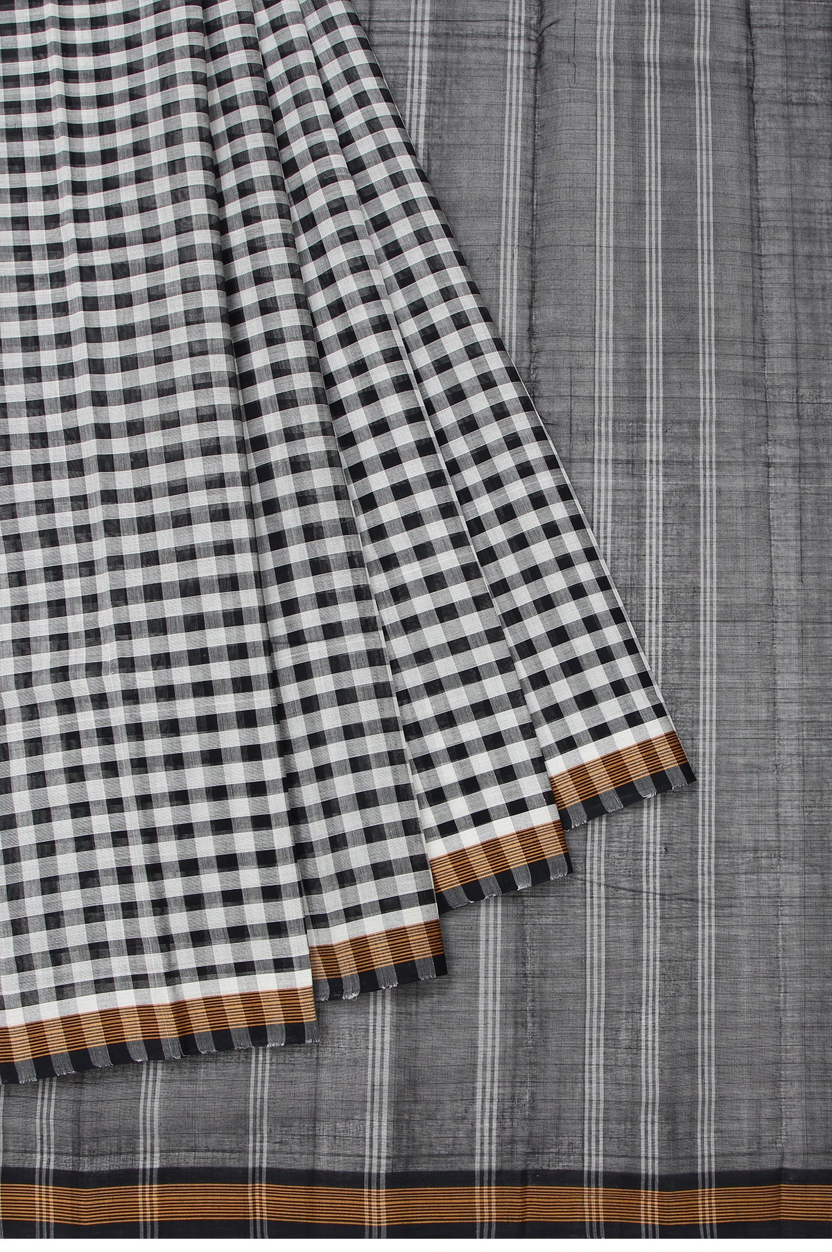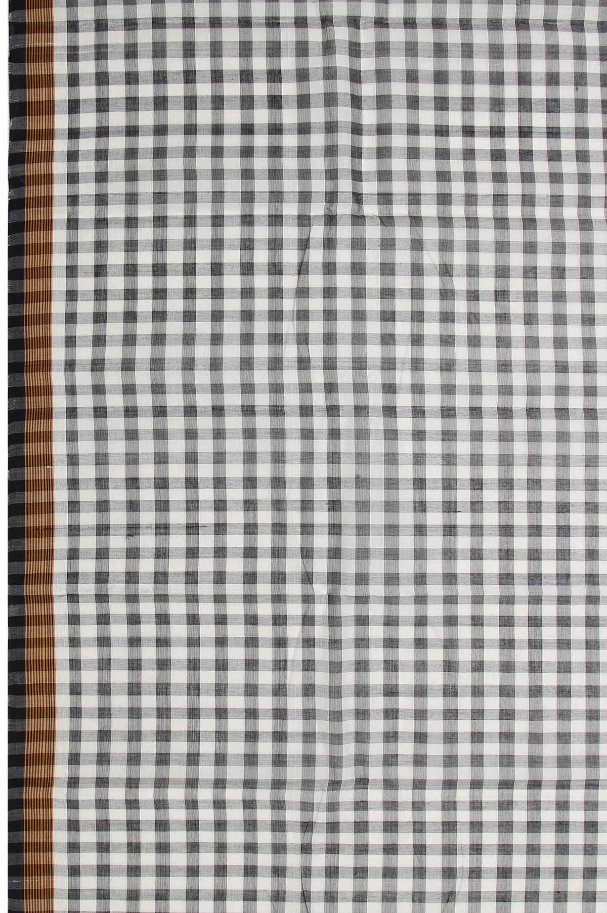This Multi Colour Kanchi Cotton Saree offers a unique blend of mustard stripes on the border, creating a vibrant contrast. The pallu, with black and white stripes, enhances its contemporary appeal. A black plain blouse with a border complements the allover multi-checks body design, making it a modern classic.