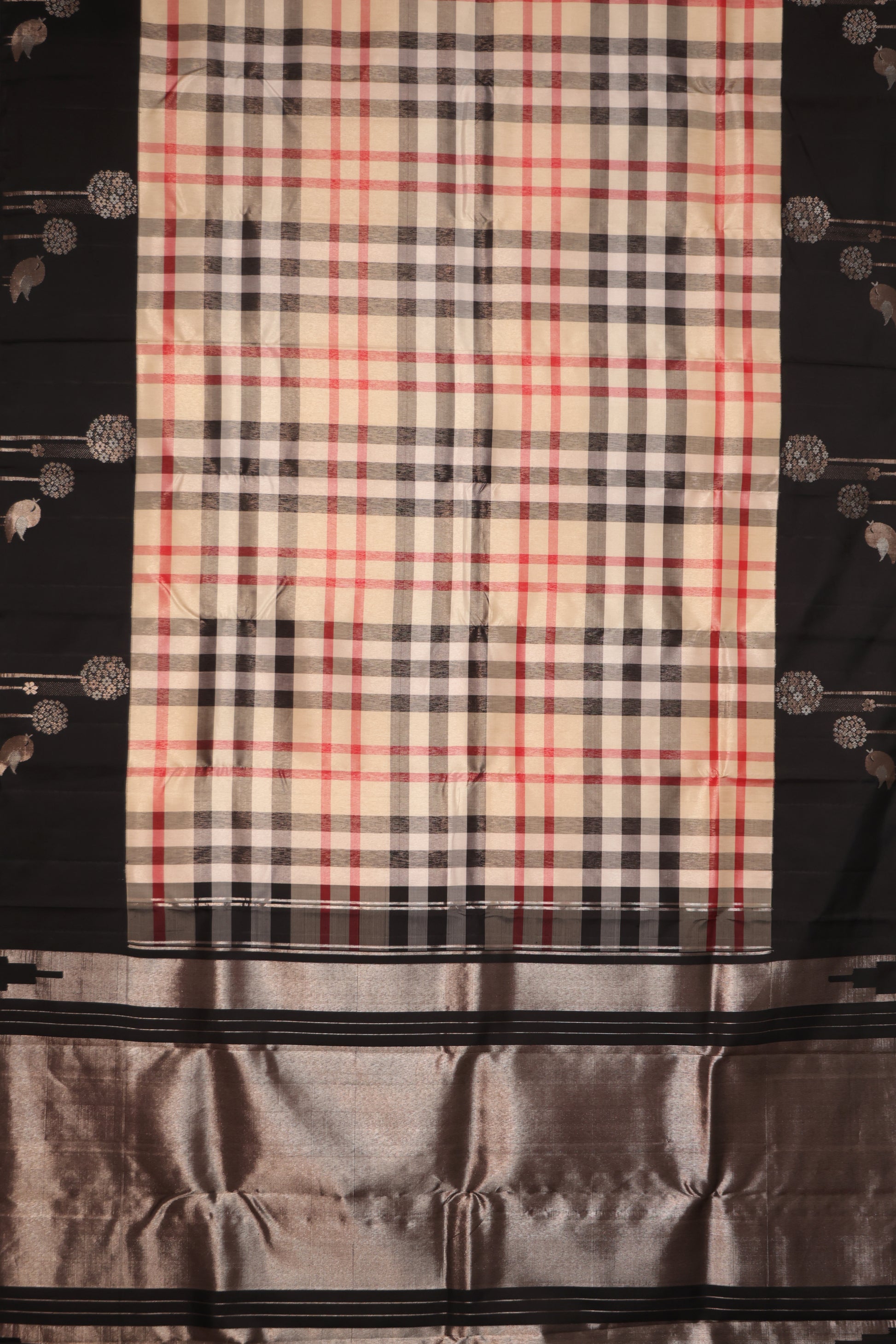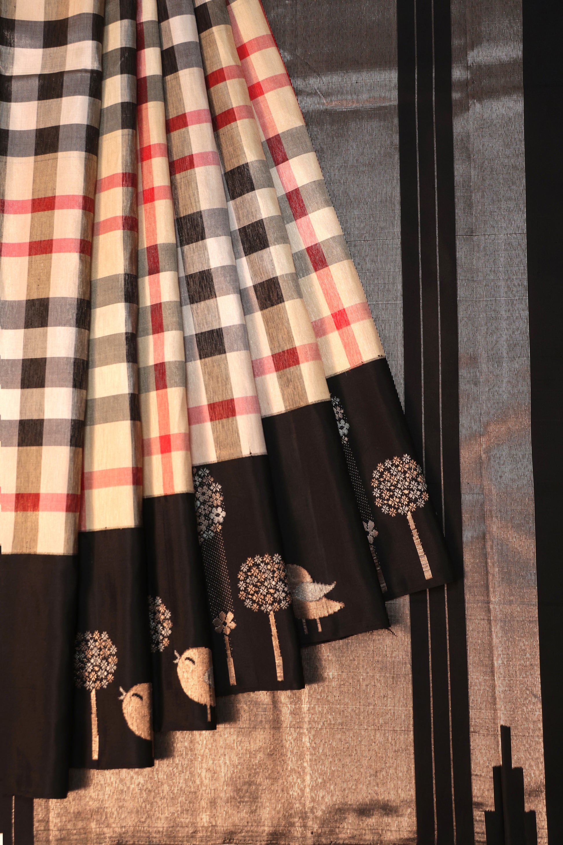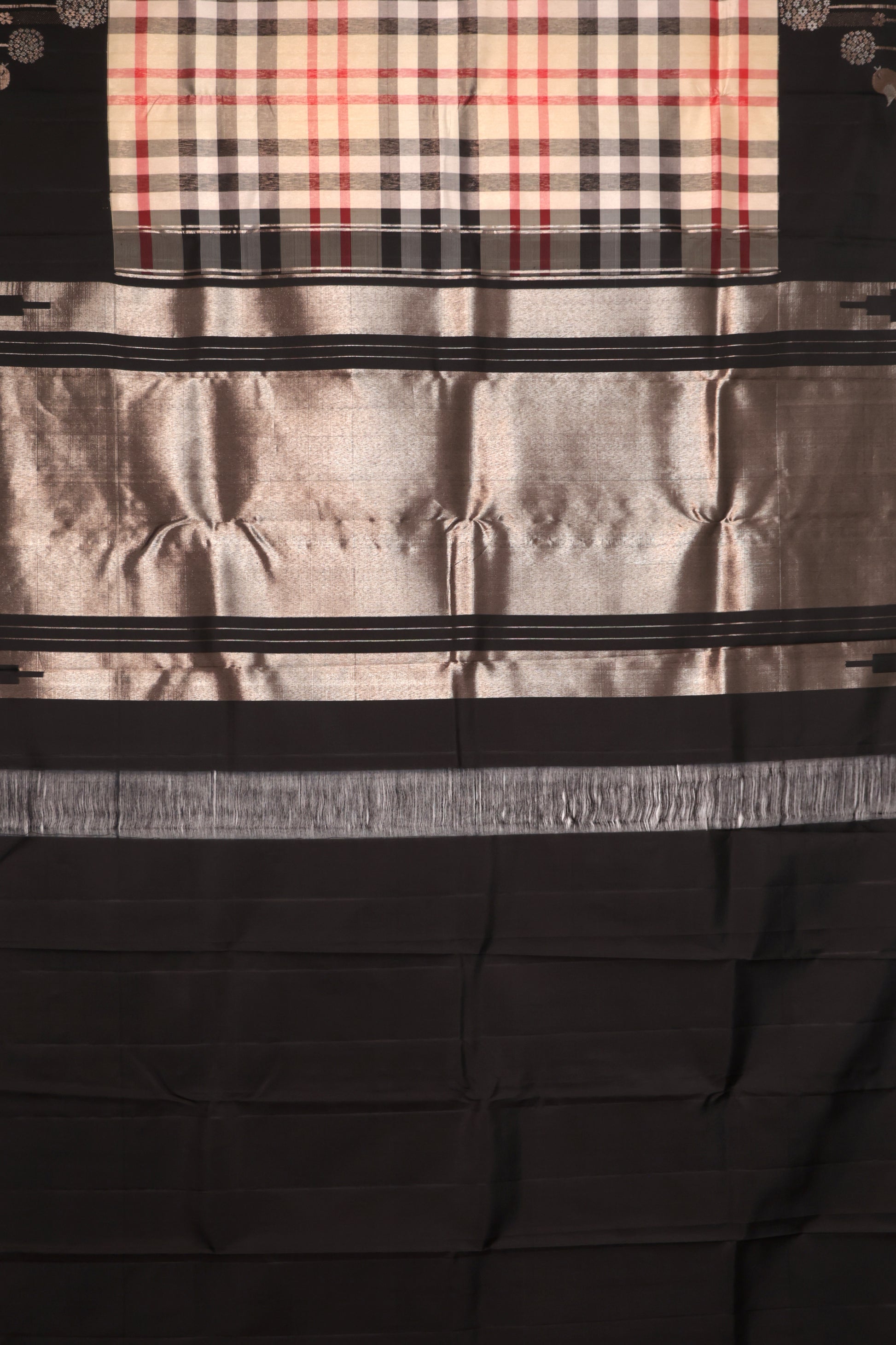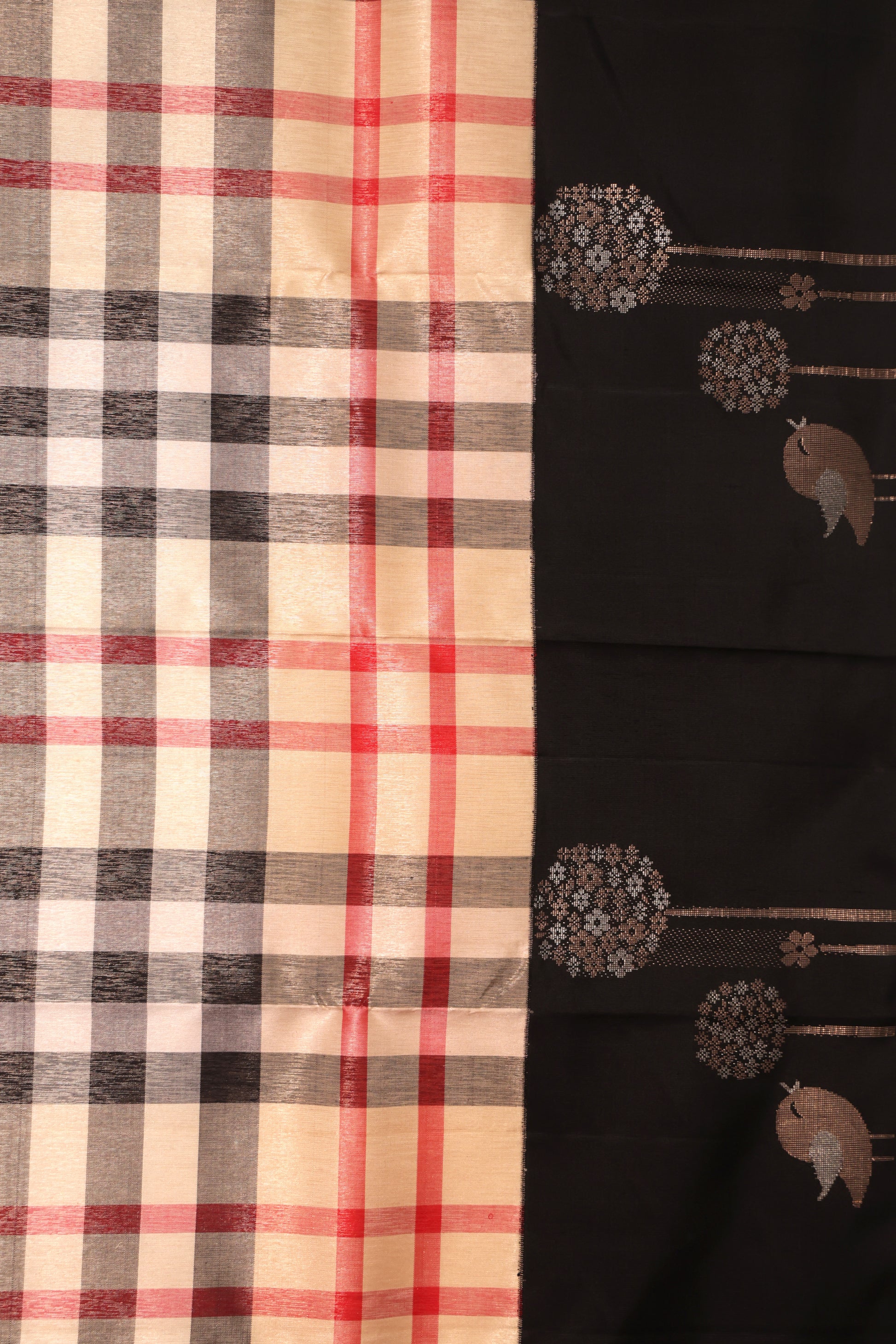 This stunning Multi-Color Kanchipuram Silk Saree combines dark, rich hues with intricate silver and copper zari checks on the body, creating a striking contrast. The black border features an elegant tree with bird motifs, woven with copper and silver zari, enhancing the traditional appeal. The pallu in black, adorned with a kaddi border and silver zari stripes, adds a touch of regal sophistication. The body showcases multi-colored checks in luxurious tissue silk, making this saree an ideal choice for weddings, festivals, and grand occasions.