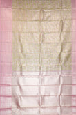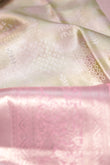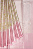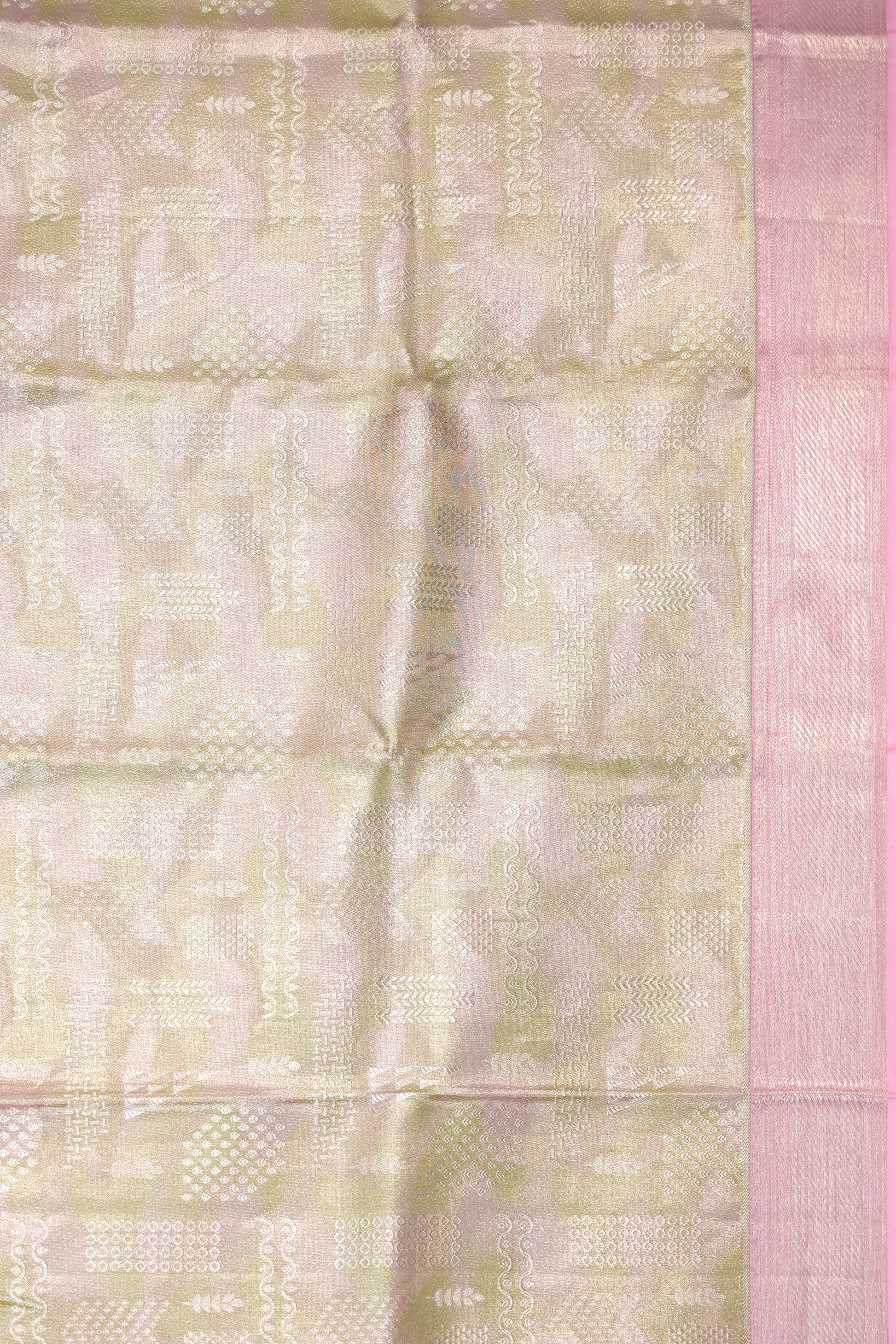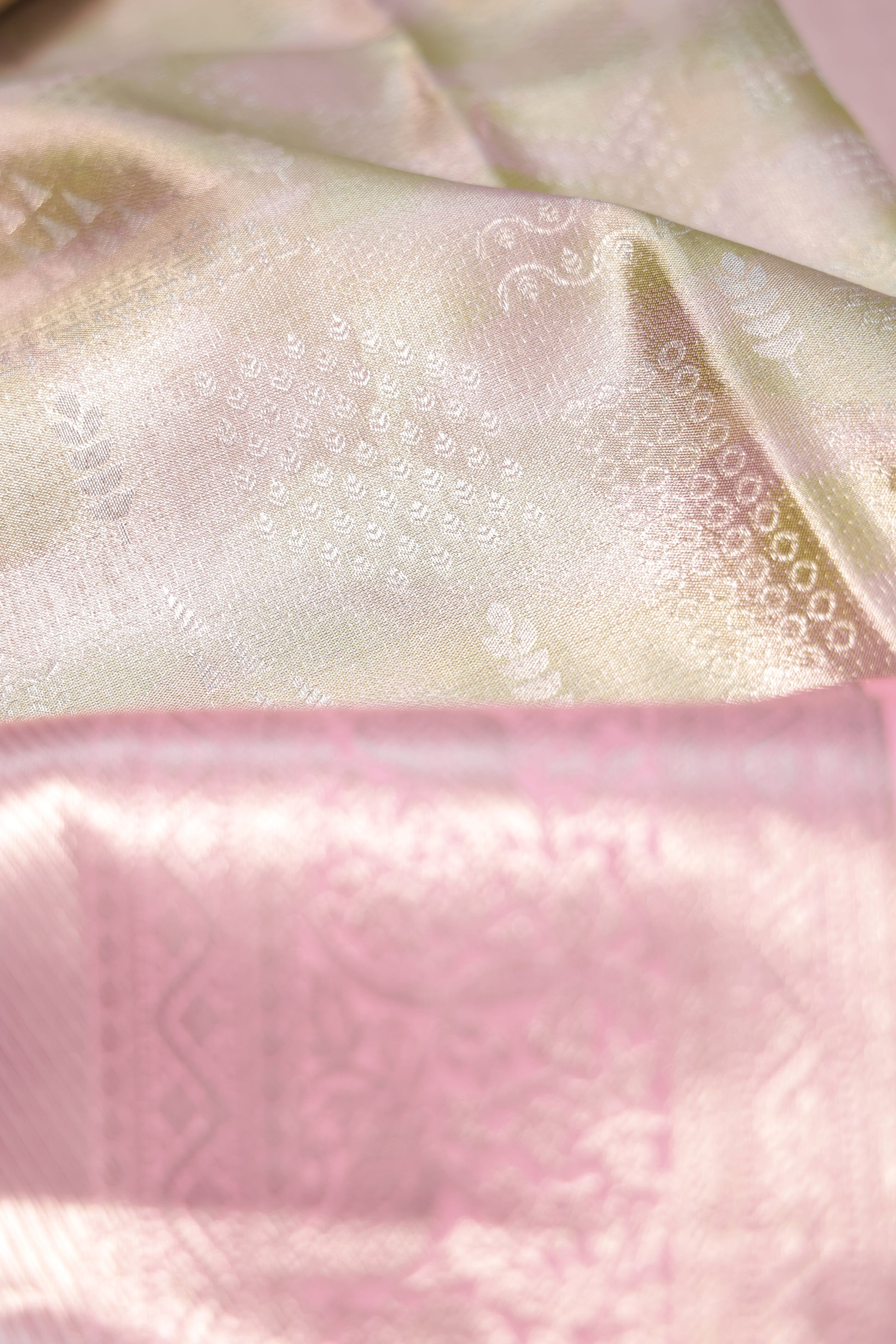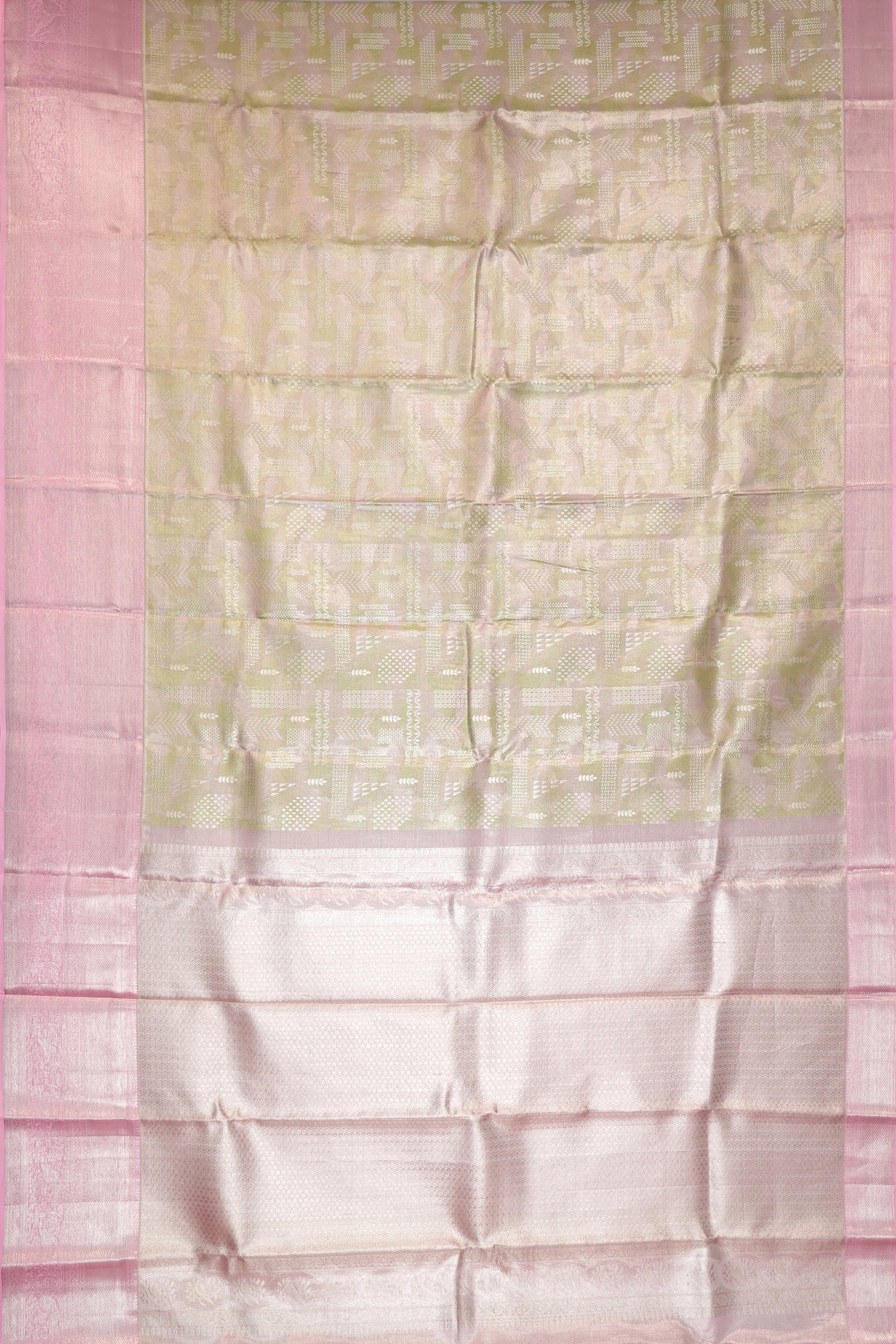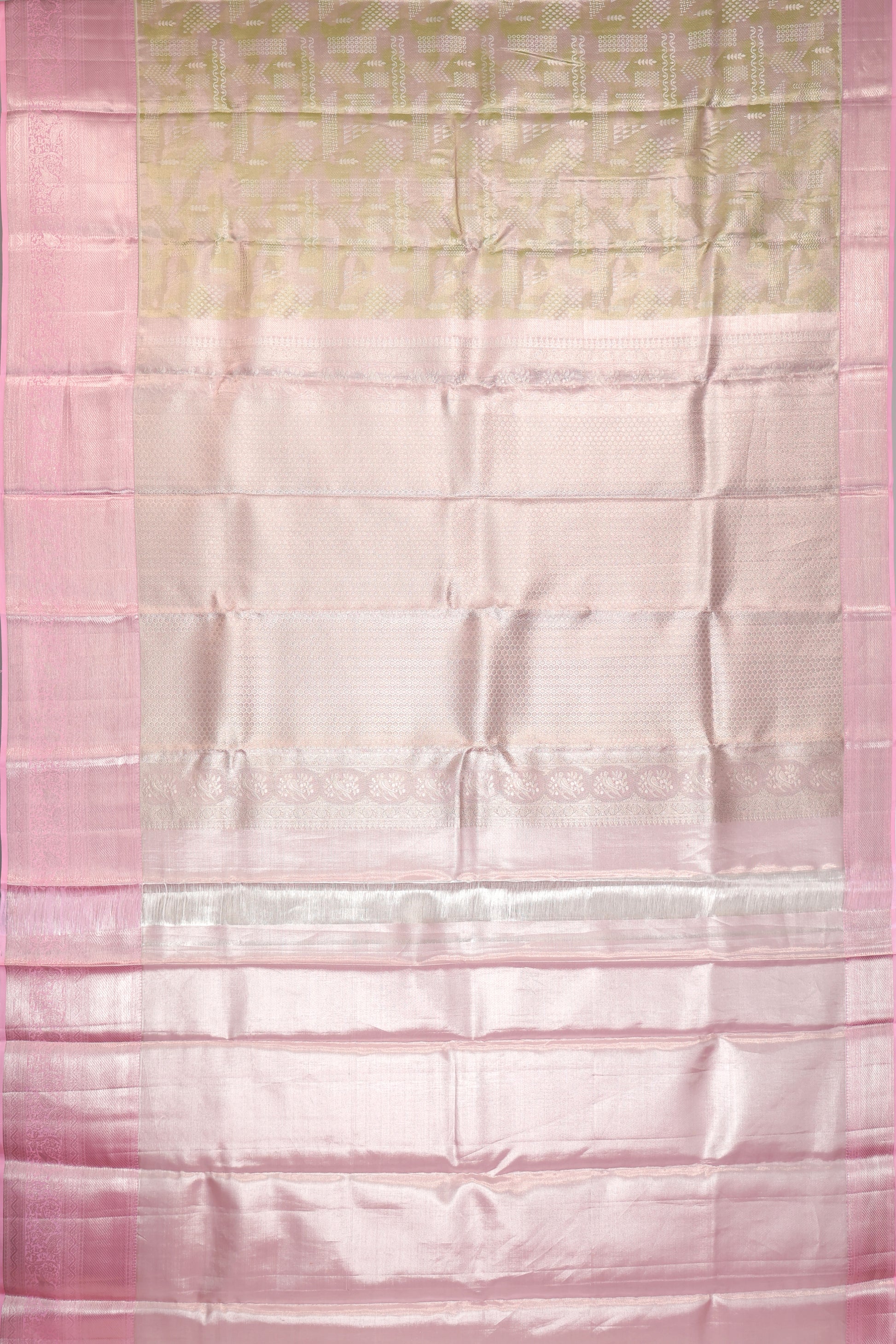 A Multicoloured Kanchipuram Tissue Silk Saree designed with an elegant silver zari geometric pattern that enhances its contemporary appeal. The lavender border features refined silver zari work with twill detailing, bird motifs, and rudraksha–leaf buttas for added character. Its matching lavender pallu showcases silver zari bird motifs, rudraksha and flower buttas, and a chevron pattern. Paired with a lavender tissue blouse in a plain finish with a coordinated border, the saree reflects impeccable craftsmanship and modern traditional charm.