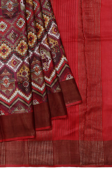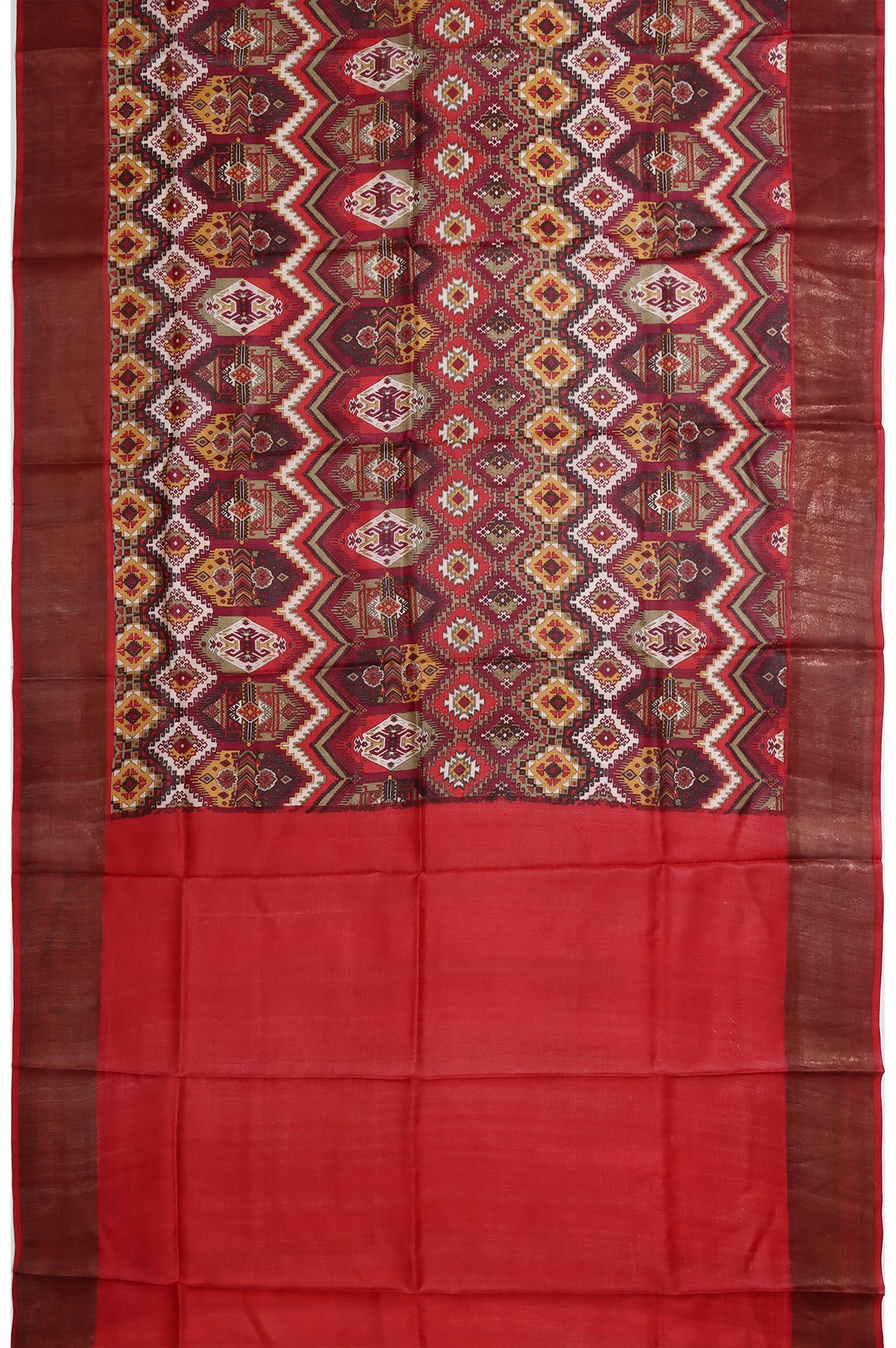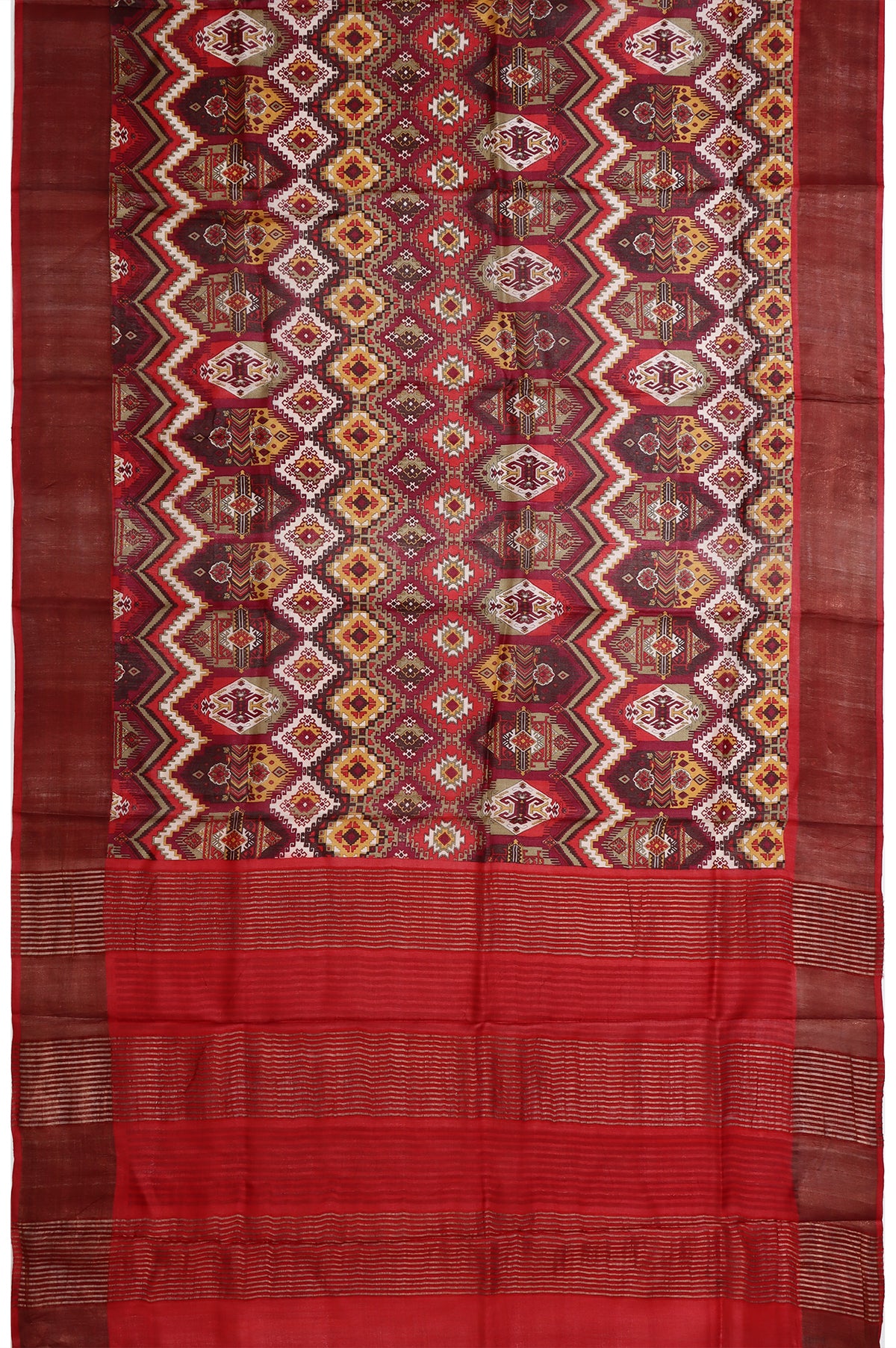 A vibrant Multicoloured Tussar Silk Saree adorned with timeless Ikat prints, perfect for festive and special occasions. The saree features a rich red copper zari kaddi border and a beautifully woven red copper zari striped pallu. Paired with a plain red blouse with matching border, this elegant drape effortlessly blends tradition with contemporary charm, making it a wardrobe essential.