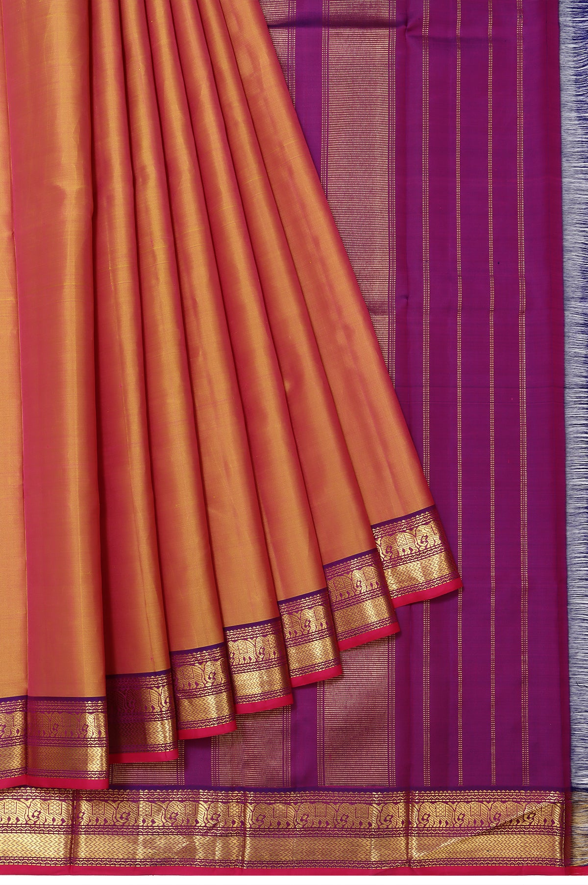 Mustard Kanchipuram Silk Saree with Purple Pallu and Yanai Motif Border