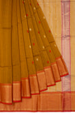 Description: Adorn yourself with our Mustard Maheshwari Silk Saree and elevate your elegance. The border showcases a mesmerizing waves design and delicate diamond butta motifs. The red pallu exudes opulence with its exquisite gold zari stripes and enchanting tassels, creating a truly captivating ensemble.