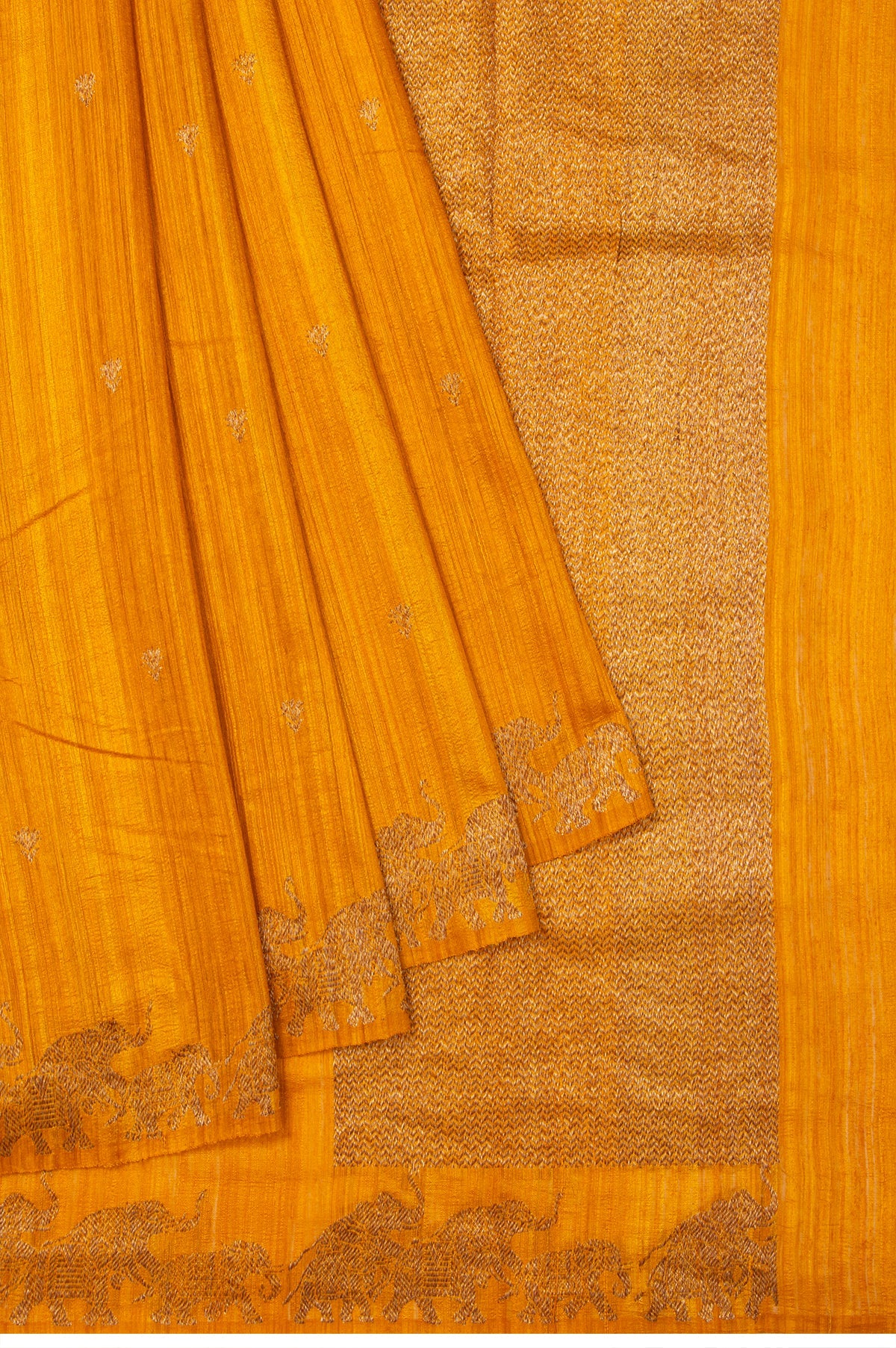 Description: Embrace the regal charm of Mustard Tussar Silk Saree with Wave Design Pallu, where intricate elephant motifs in gold zari adorn the self-colored borders. Waves of design gracefully embellish the pallu, reflecting artisan finesse. The blouse, plain with a border, adds a touch of simplicity and elegance. The body dazzles with delicate flower butta patterns in shimmering gold zari, showcasing meticulous craftsmanship.