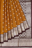 Description: Mustard Mystique: Embrace the warmth of mustard with this Venkatagiri silk saree. The contrasting brown border shines with silver zari, artfully presenting a chevron pattern intertwined with majestic peacock motifs and chakra designs. The brown pallu, embellished with silver zari, showcases a check pattern dotted with flower buttas, yali motifs, and peacock designs. The saree is complemented by a plain brown blouse adorned with a border, while its body exudes elegance with its silver zari and flower buttas.