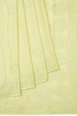 Radiate charm with the Neon Green Kota Doria Silk Saree, featuring a self-colored border with chikankari work, paisley design, and neon green piping border. The Pallu is a work of art with self-color, chikankari work, floral jaal, flower motifs, gold zari, and kaddi stripes. The body design showcases exquisite chikankari work and charming flower butta motifs.