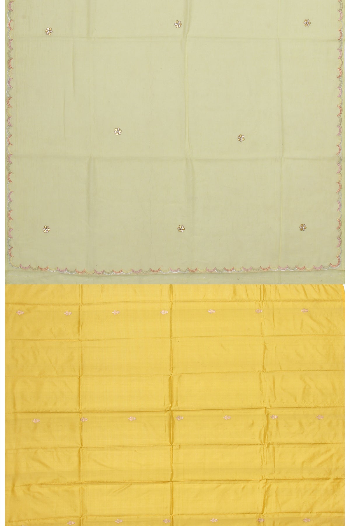 Radiate vibrancy with this striking Neon Yellow chanderi silk cotton saree, featuring an allover scallop border that adds a unique touch. The pallu, adorned with a matching scallop design, beautifully complements the body, which is decorated with intricate gota patti buttas. The mustard yellow blouse, highlighted with copper zari buttas, completes the look, making this saree a standout choice for festive celebrations.