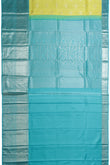 Bold and graceful, this Neon Yellow Kanchipuram Silk Saree showcases an elegant floral jaal in lustrous silver zari. The striking sea blue border is adorned with intricate twill patterns, graceful mayil motifs, and rich floral jaal in silver zari. Its sea blue pallu features classic checks and delicate flower buttas, adding to its festive charm. Paired with a plain sea blue blouse with border, it’s a radiant traditional statement.
