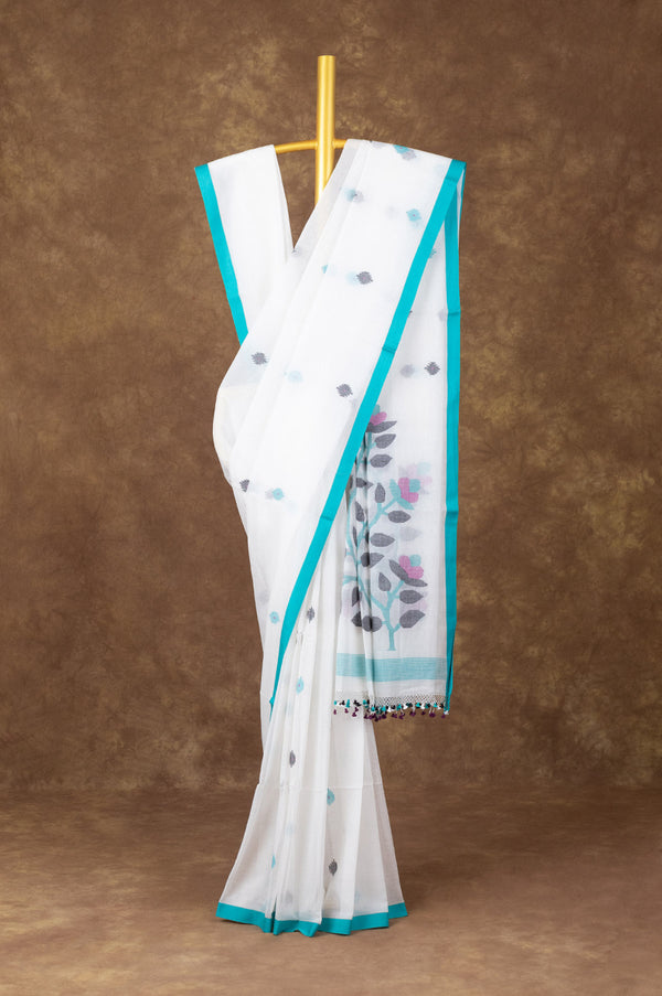 Here is a saree steeped in tradition. At the same time, it is trendy. The thread butta beautifully dot the body. Sporting tree motifs, the pallu seems to be giving a green message. Jamdani work and sea green motifs further add to its charm. The dangling tassels complete the picture. The thin border shows up in heart-winning sea green colour.