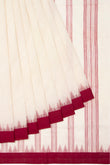 The off-white Ponduru Cotton Saree boasts a maroon border with thazhampoo reku accents and a striped pallu with tassels. The self-colored blouse with a border complements the saree perfectly.