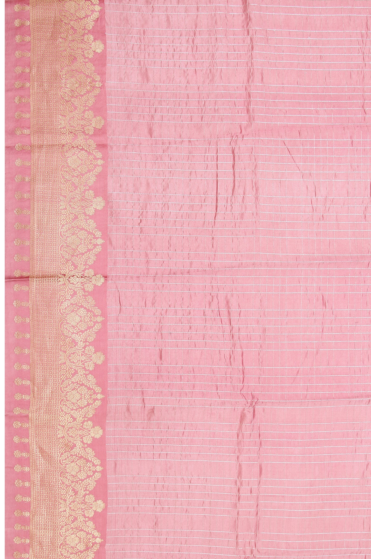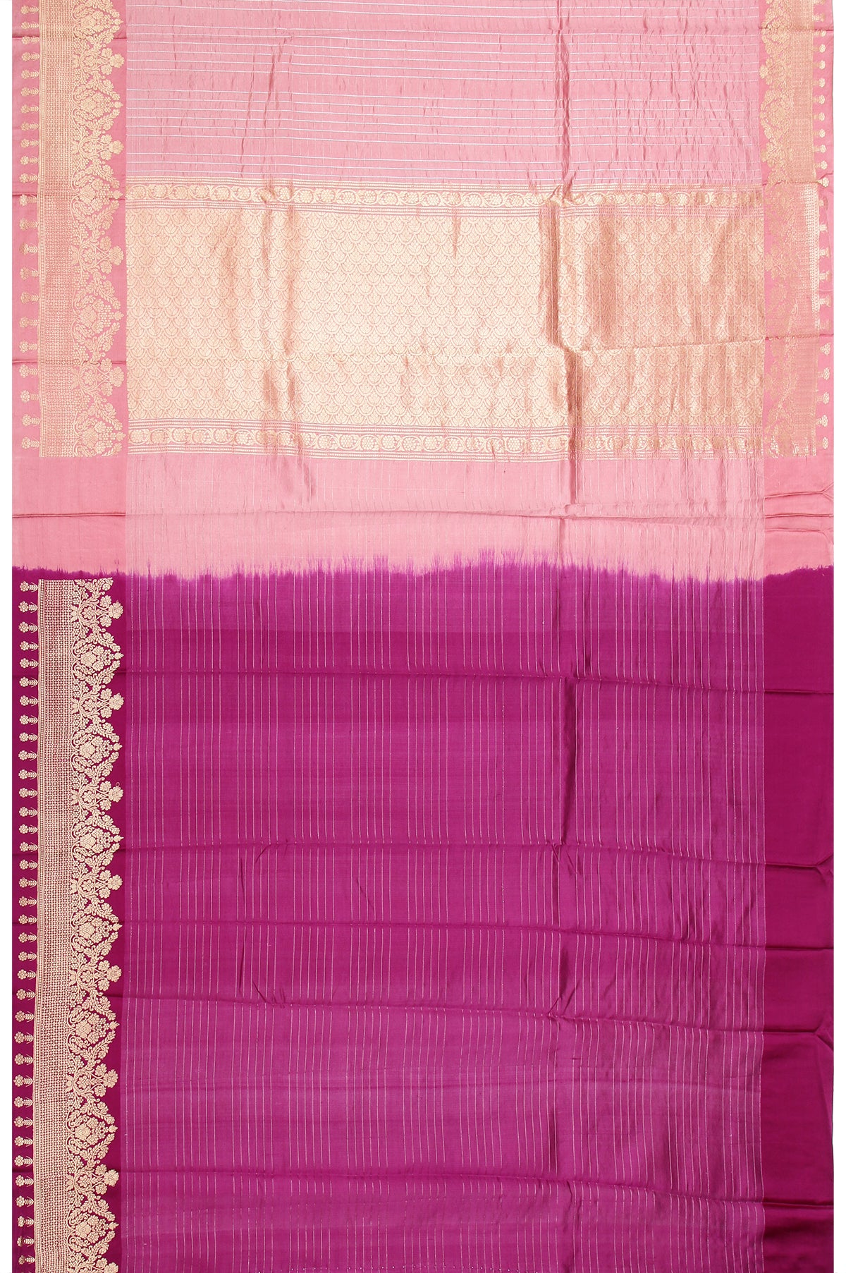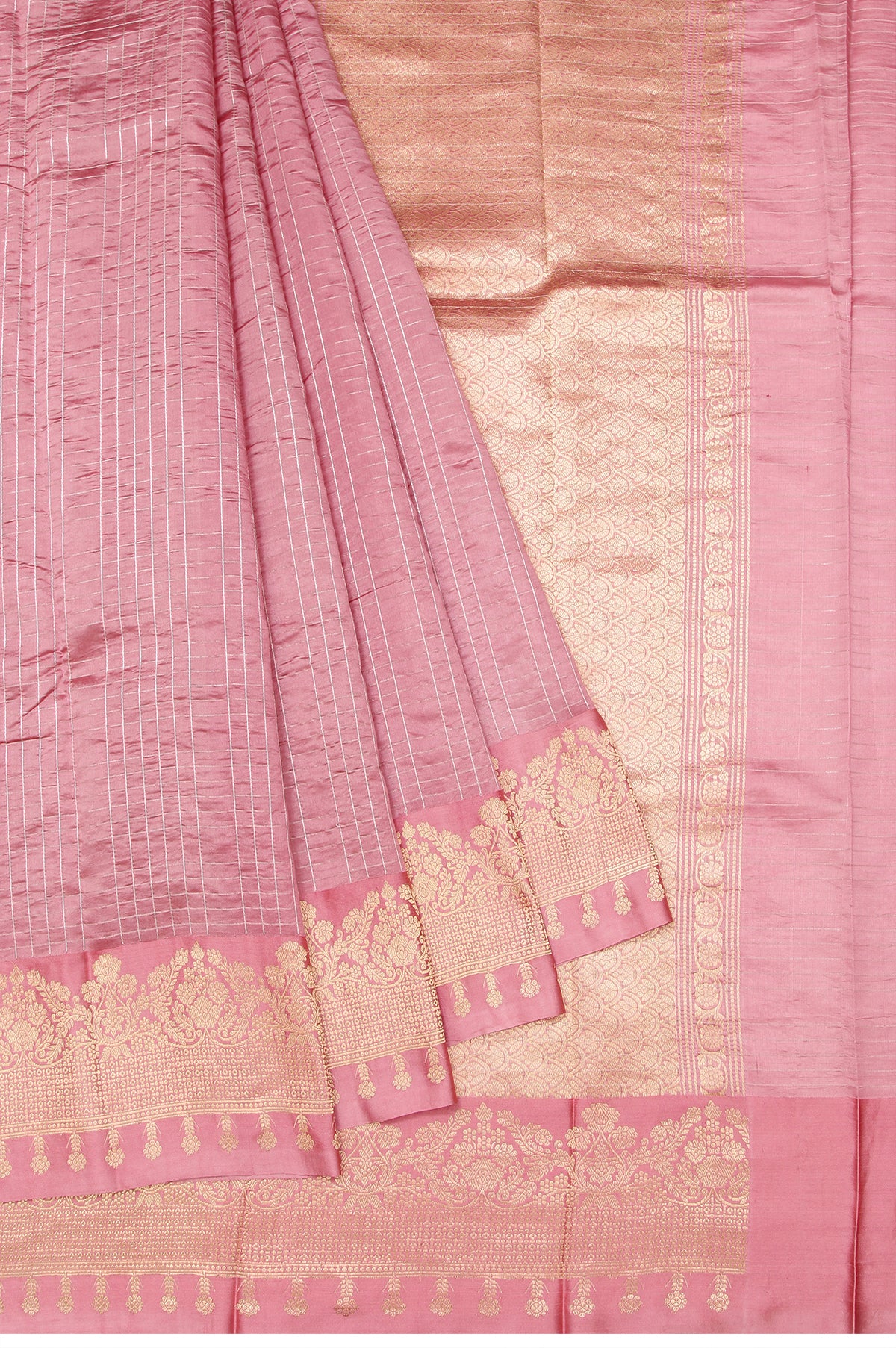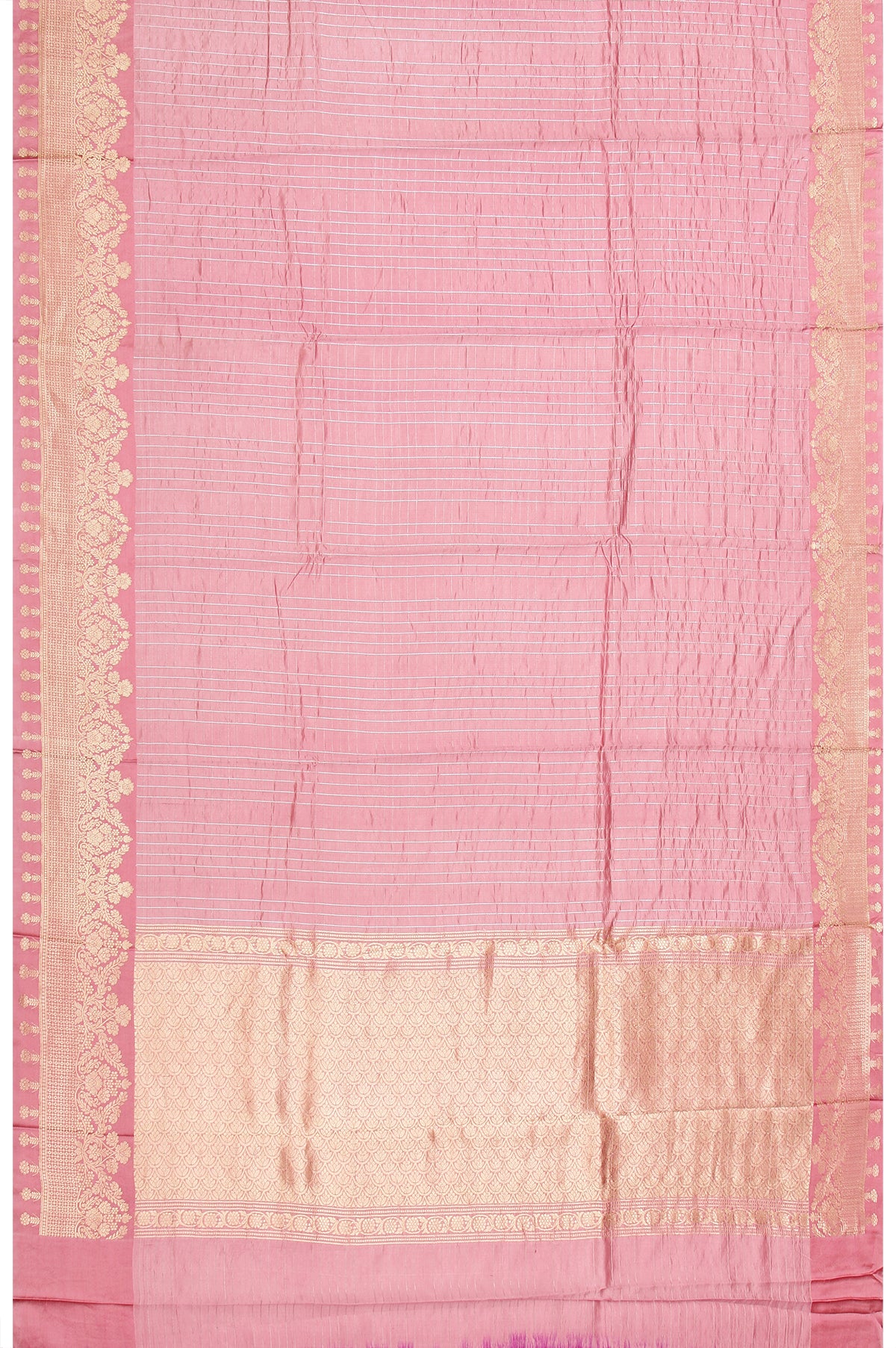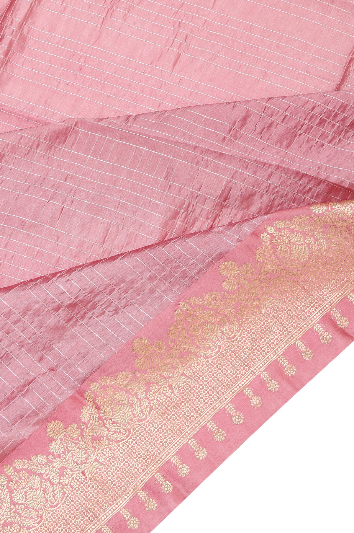 Embrace the beauty of tradition with this lovely Onion Pink Chiniya Silk Saree, featuring a self border with gold zari and captivating floral motifs alongside geometric designs. The pallu showcases self color with a combination of gold and silver zari, beautifully adorned with floral motifs and striking silver zari stripes. A magenta blouse with silver zari stripes adds a vibrant contrast. The body design consists of gold and silver zari stripes, creating a harmonious blend of elegance and style, ideal for festive celebrations.