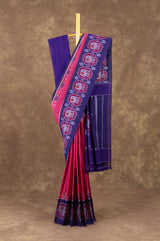 Here is a jumbo attraction. This pink Ikat cotton saree is a genuine reflection of Indian ethnicity and culture and the elephant motifs in the navy border say it all. Accompanying flower butta and temple design are equally attractive. The pallu, with the same elephant motifs and flower butta, emanates similar vibes.
