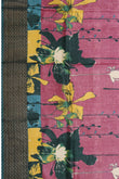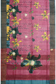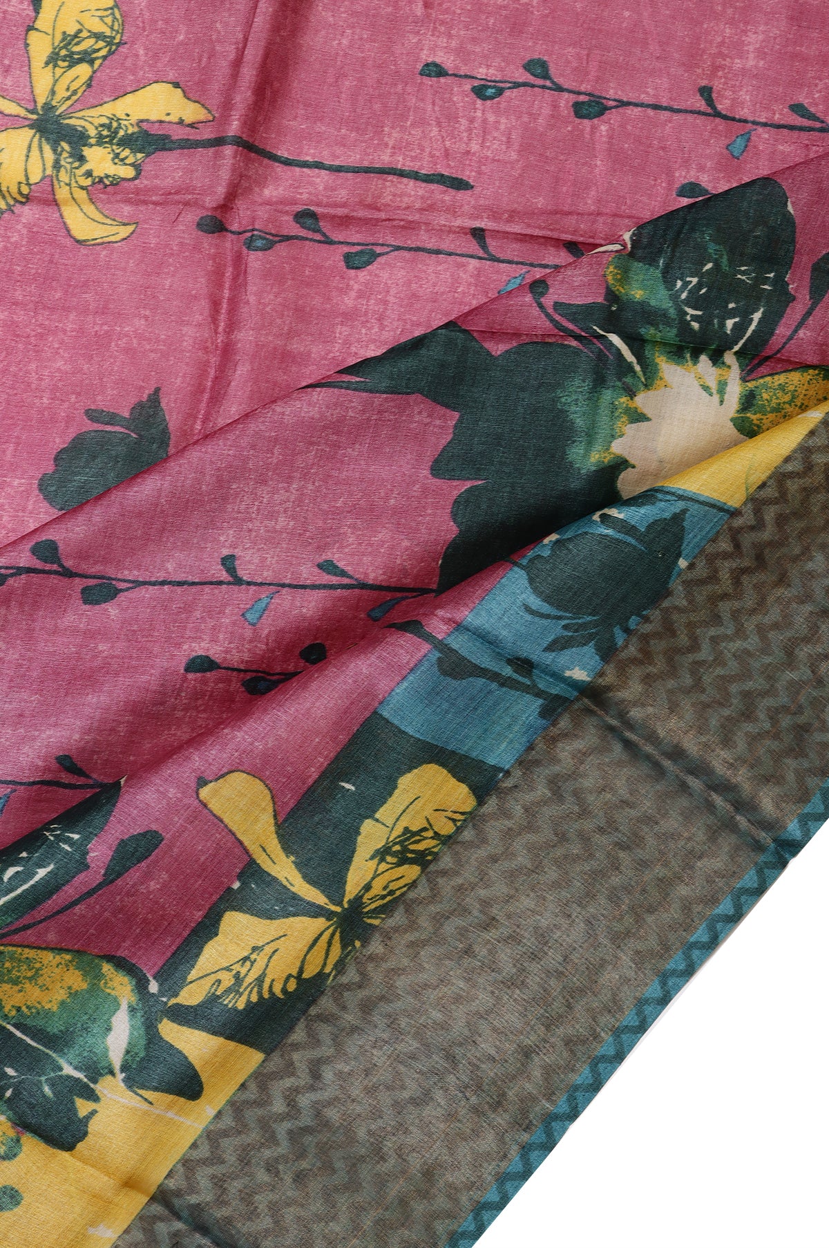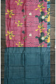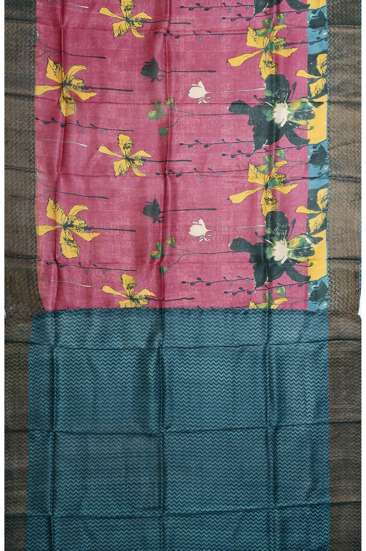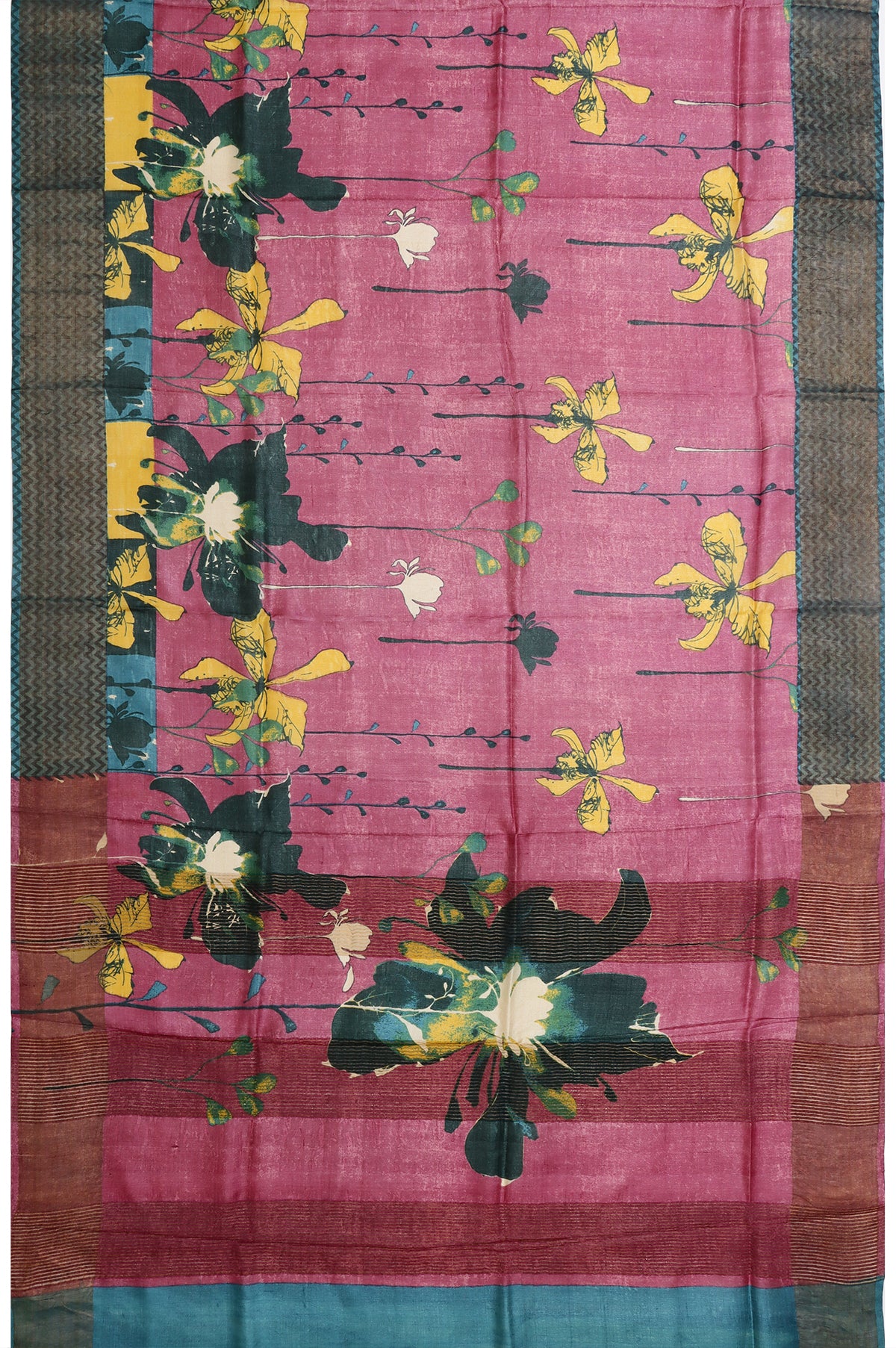 Onion Pink Tussar Silk Saree with Floral Printed Motifs and Peacock Blue Border