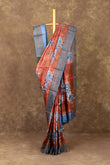 Make a striking impression in a orange saree with a copper zari kaddi border. The body design showcases elegant flower motifs, adding a touch of sophistication to the plain grey blouse.
