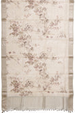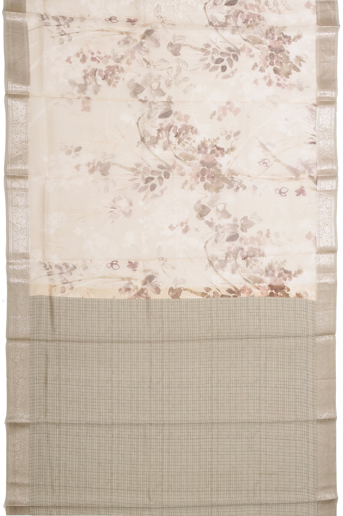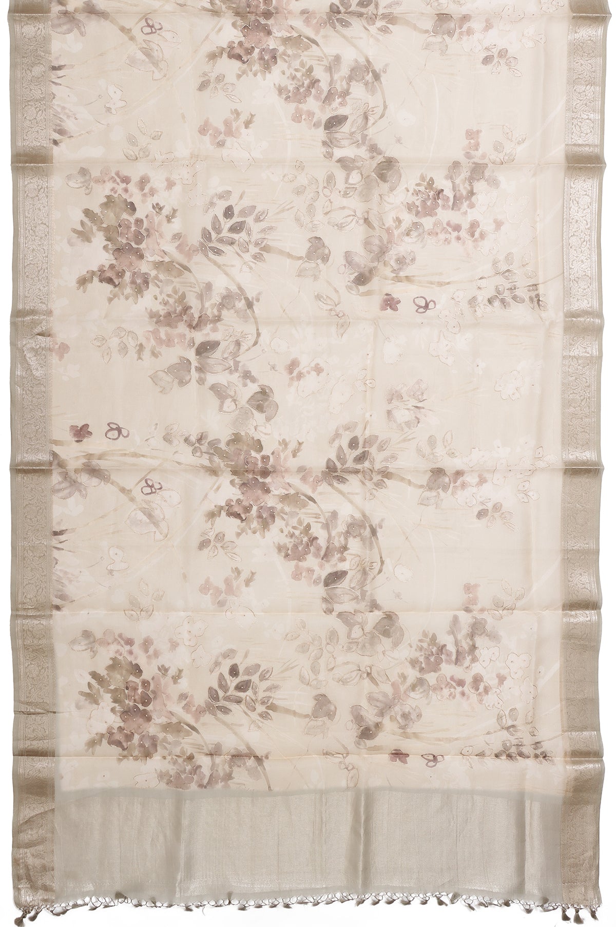 Description - This Beige Organza Saree showcases timeless charm with delicate embroidery work, gold zari accents, and graceful floral motifs. The self-border features silver zari floral creepers and leaf buttas, while the contrasting beige pallu is adorned with silver zari stripes and tassels. Paired with a Chiniya olive green blouse in printed checks with border, it's perfect for elegant celebrations.
