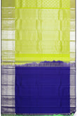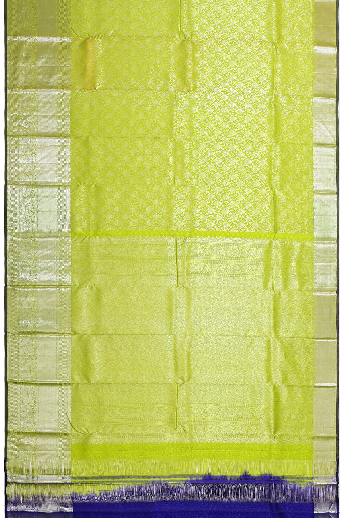 Description -Vibrant and majestic, this Parrot Green Kanchipuram Silk Saree is adorned with a rich silver zari jaal, elegantly woven across the body. The self-coloured border features intricate silver zari detailing with leaf, rudraksha, diamond, and flower buttas, alongside graceful Yanai (elephant) and Mayil (peacock) motifs, finished with a striking blue piping. Its pallu mirrors the artistry with leaf, flower, and mango buttas set against silver zari stripes. Paired with a Blue embossed blouse featuring mango buttas and matching border for a regal, festive look.
