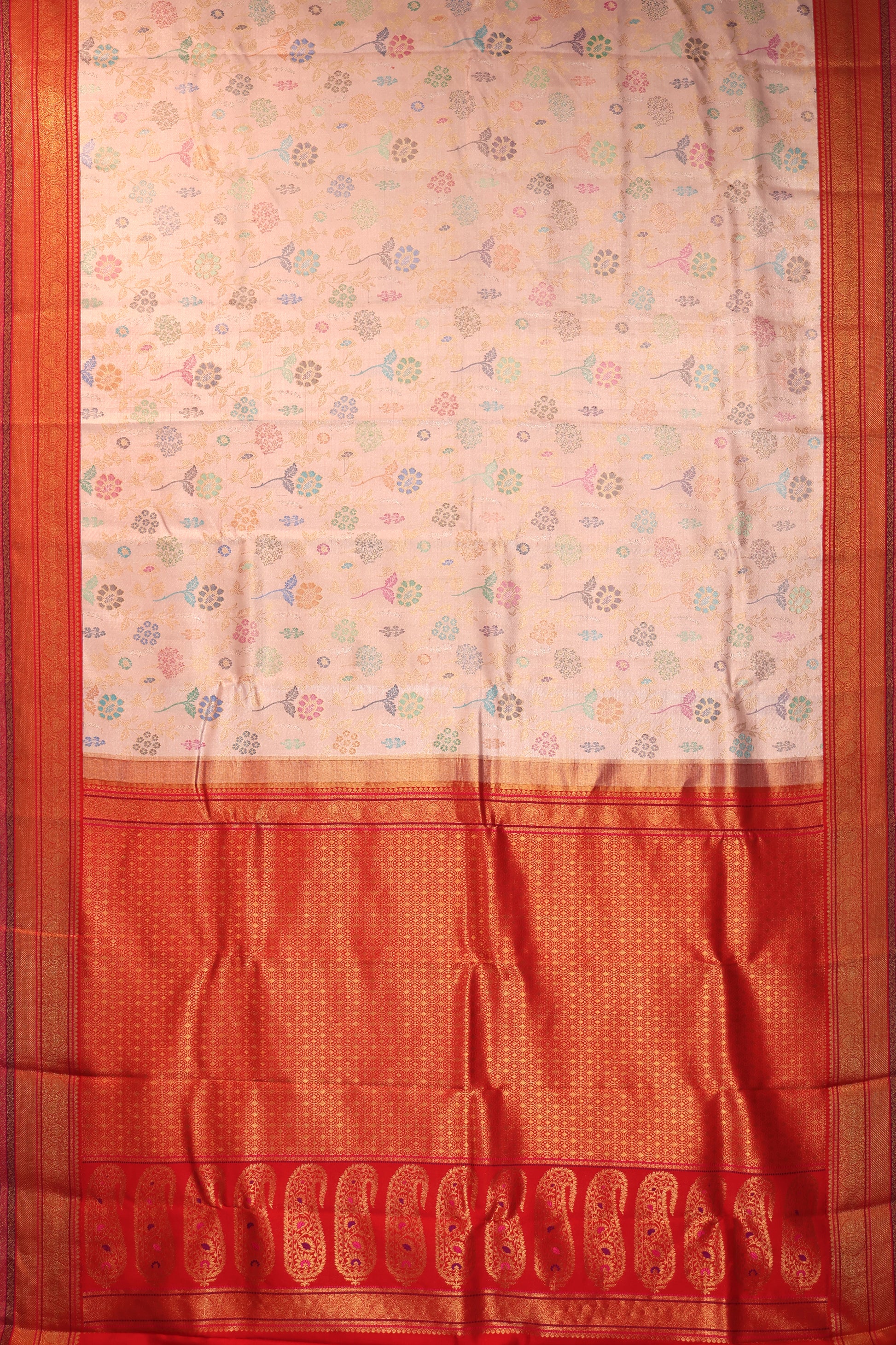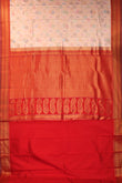 Drape yourself in timeless elegance with this Peach Kanchipuram Silk Saree featuring a rich red kuttu border adorned with gold zari, leaf, and floral creeper motifs. The silver and gold meenakari tree motifs enhance its charm, while the intricate pallu with paisley designs and plain red blouse add a touch of regal sophistication.