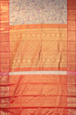 Graceful and vibrant, this Peach Kanchipuram Tissue Silk Saree features Gold and Silver Zari with intricate Kili motifs and floral brocade patterns. The Pink border dazzles with diamond checks, twill design, and leaf buttas, while the Red pallu showcases floral creepers and stripes in Gold Zari. Comes with a Red tissue plain blouse with matching border for a regal finish.
