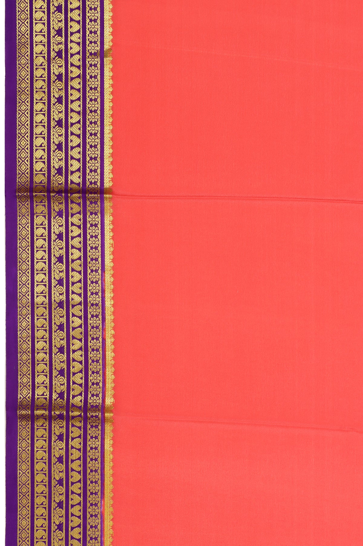 A charming Peach Mysore Silk saree, paired with a striking Royal Blue border featuring Gold Zari leaf motifs, floral buttas, mango designs, peacocks, hearts, and diamond buttas. The Royal Blue pallu shimmers gracefully with Gold Zari stripes. Completed with a plain Royal Blue blouse and matching border, it’s an elegant choice for festive gatherings and traditional celebrations.