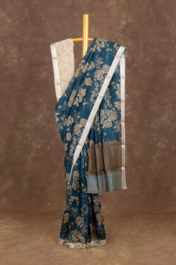 The peacock blue Chanderi Silk Cotton Saree features pleasant flower motifs all over. This is one piece you have to possess for its calming appeal. The beige border emanates similar vibes, though it is chock-a-block with silver zari, floral creeper, leaf design and green and pink thread butta. The pallu shows up with silver zari and stripes.
