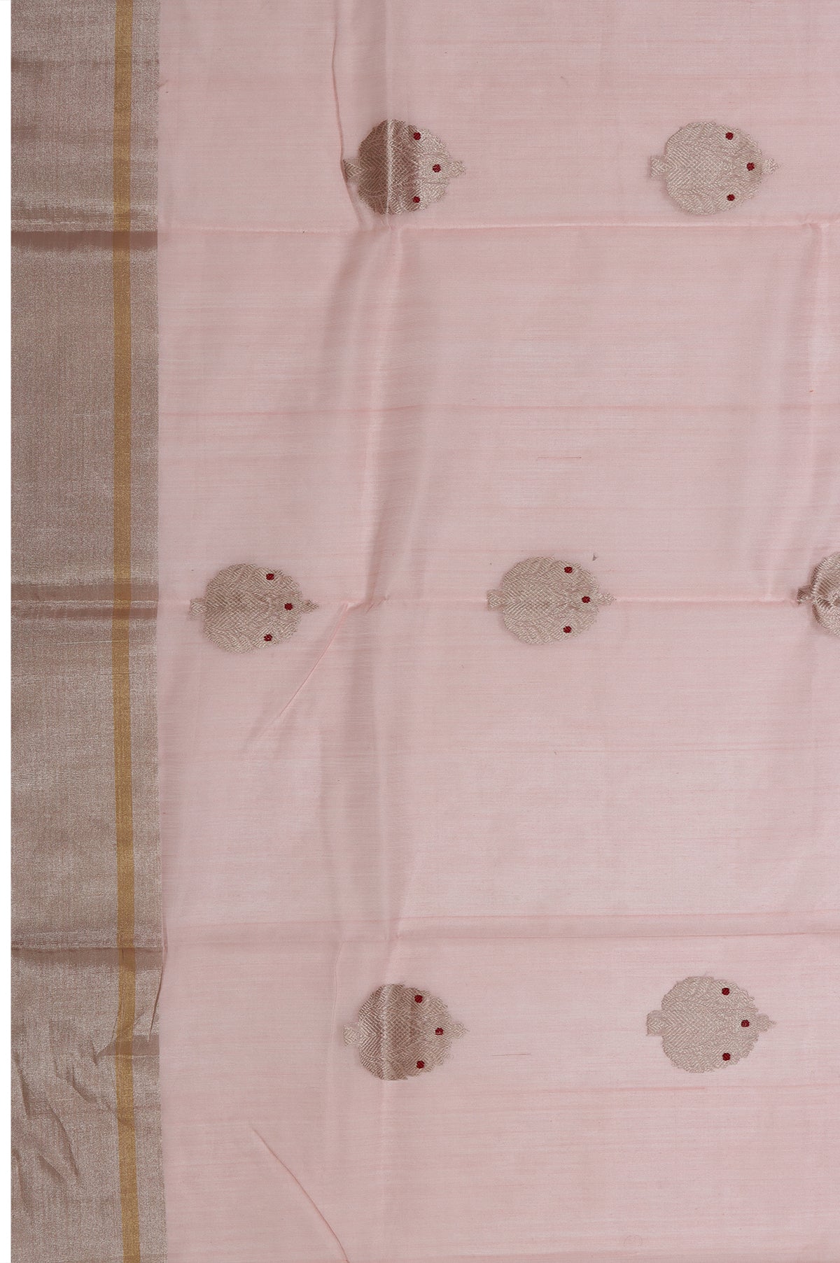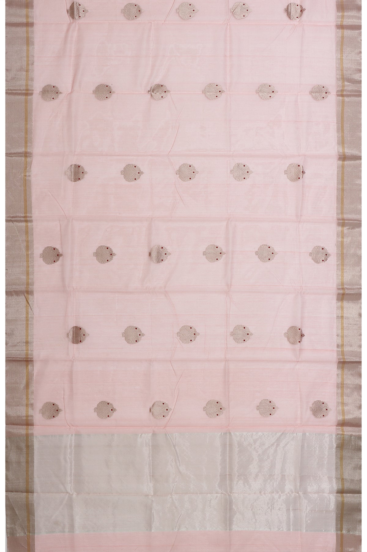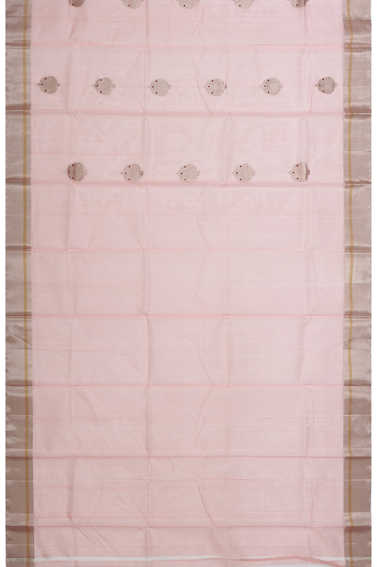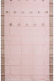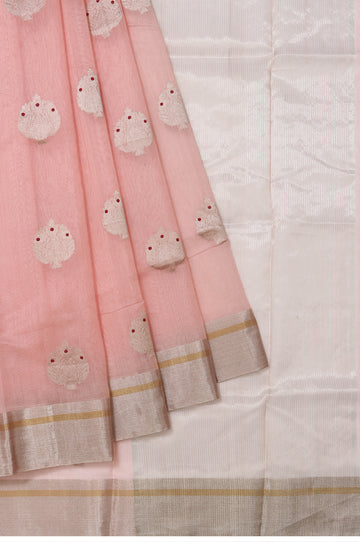 Elegant and airy, this Pink Chanderi Silk Cotton Saree is adorned with graceful gold zari tree motifs scattered across its soft, lustrous body. The self-coloured border features a refined blend of silver zari kaddi and gold zari stripes, adding subtle shimmer. Its pallu continues the elegance with classic gold zari stripes. Paired with a plain self blouse with border, it’s perfect for graceful day functions and festive gatherings.