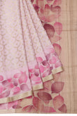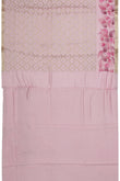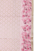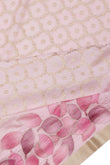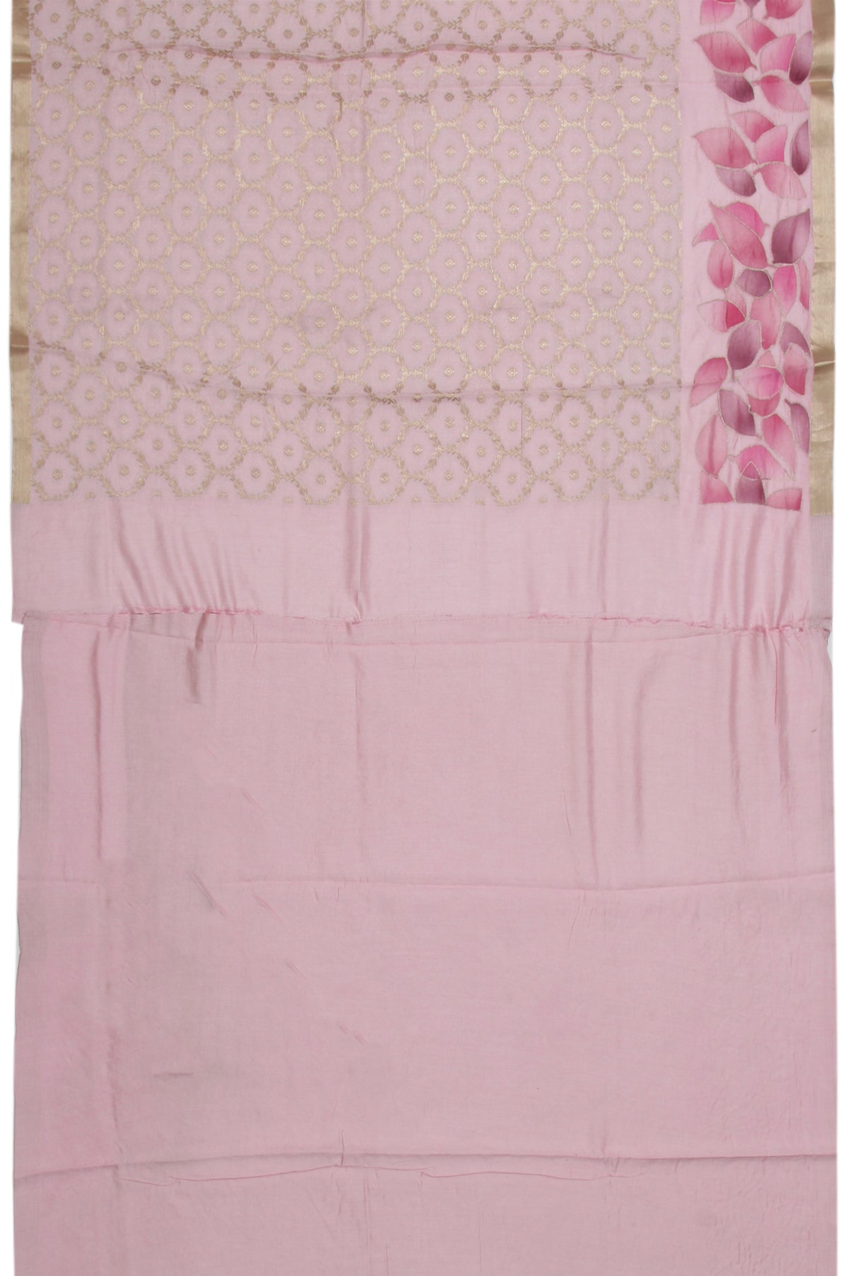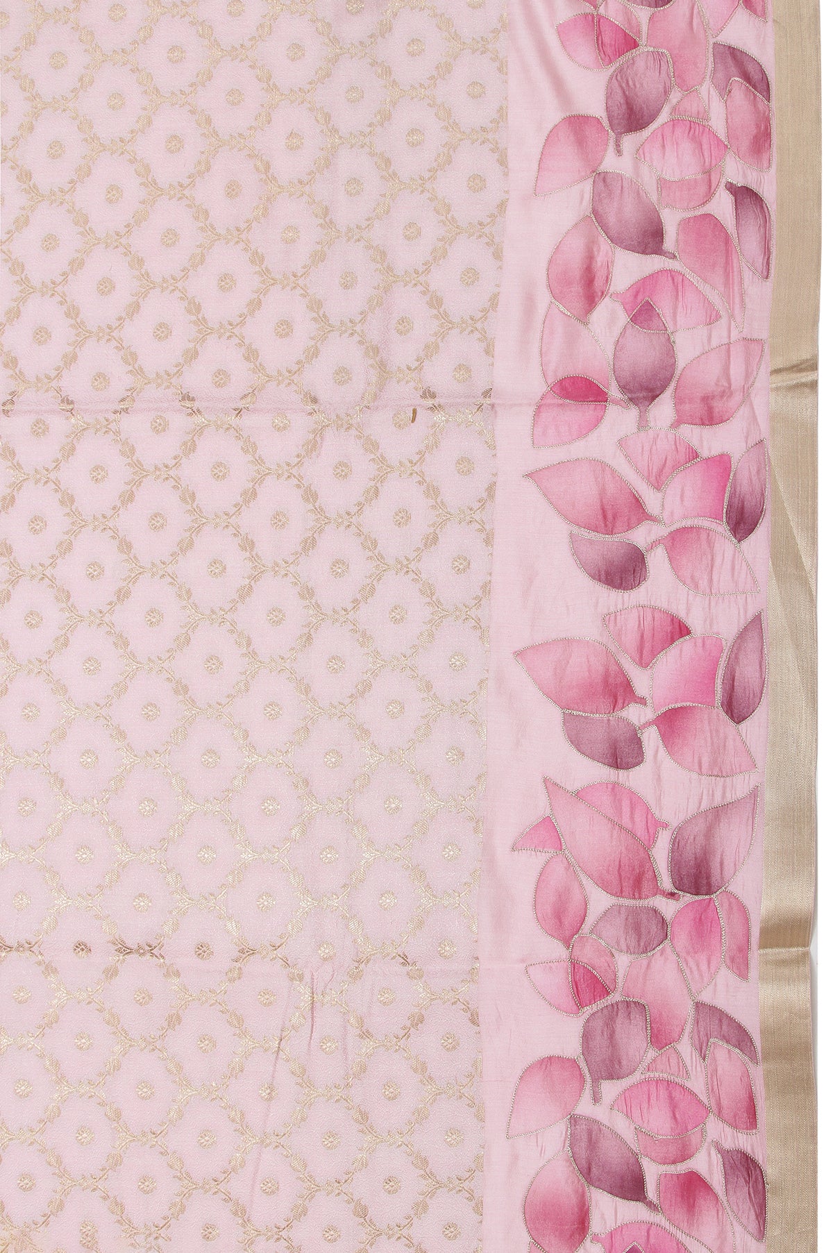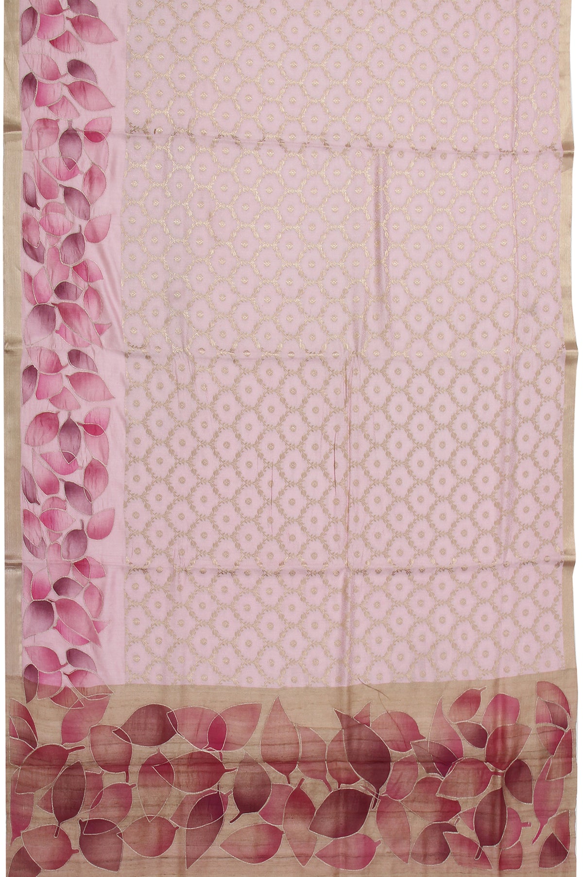 This Pink Chiniya Silk Saree boasts a leaf design with zari work on the self-border and kaddi border. The beige pallu features leaf motifs and zari work, while the blouse remains plain with a border to match the floral jaal design with flower buttas on the body.