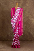 Radiate grace and charm in our Pink Ikat Saree, graced with a Gold Zari Kaddi border and Ikat design. The Pallu continues the allure with Pink hues, Gold Zari accents, captivating Ikat motifs, and subtle stripes. Adorned with a Pink Gold Zari Kaddi border, this saree is the epitome of timeless elegance.