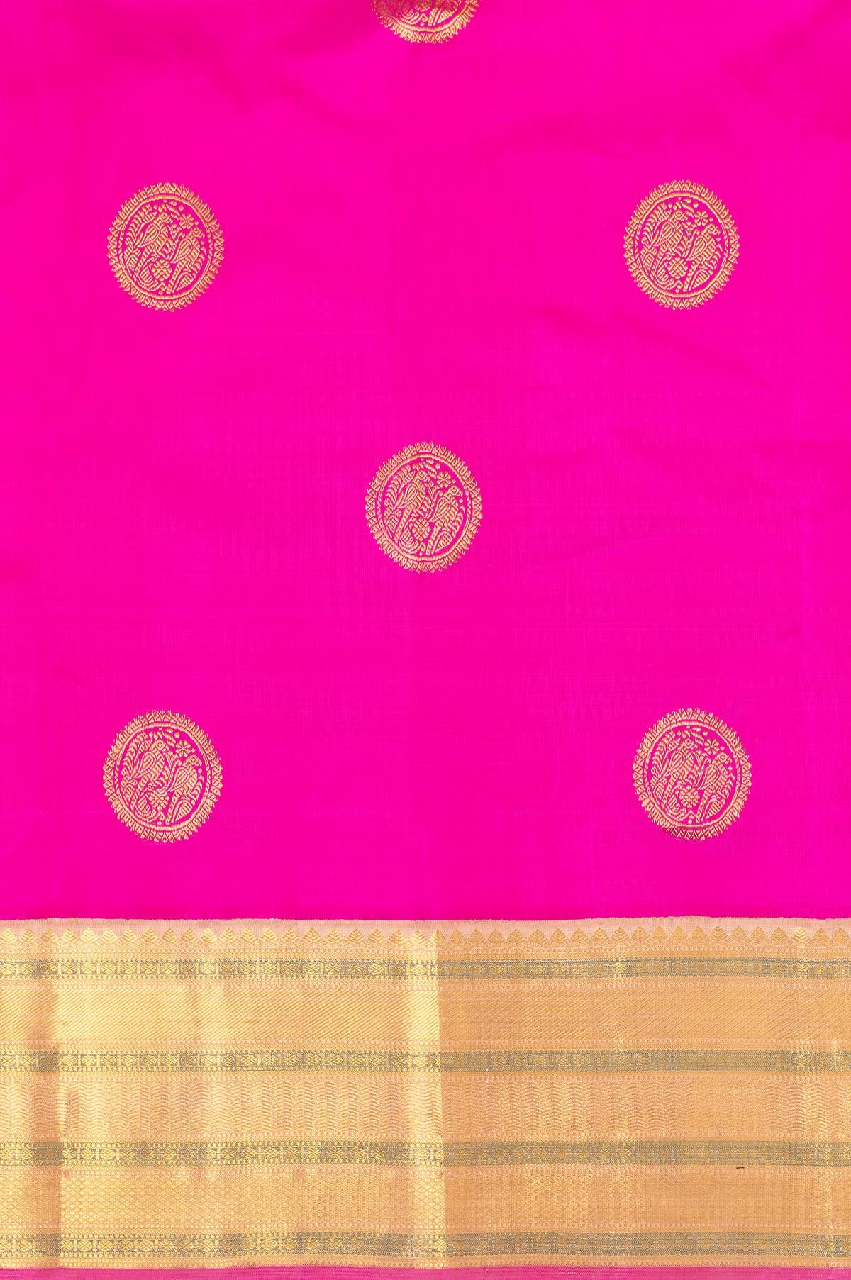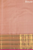 Radiate elegance in this pink and sandal saree with a self-colored kaddi border adorned with gold zari. The sandal pallu features cross lines, leaf butta, and temple design, while the body design showcases gold zari and circle butta with kili motifs.