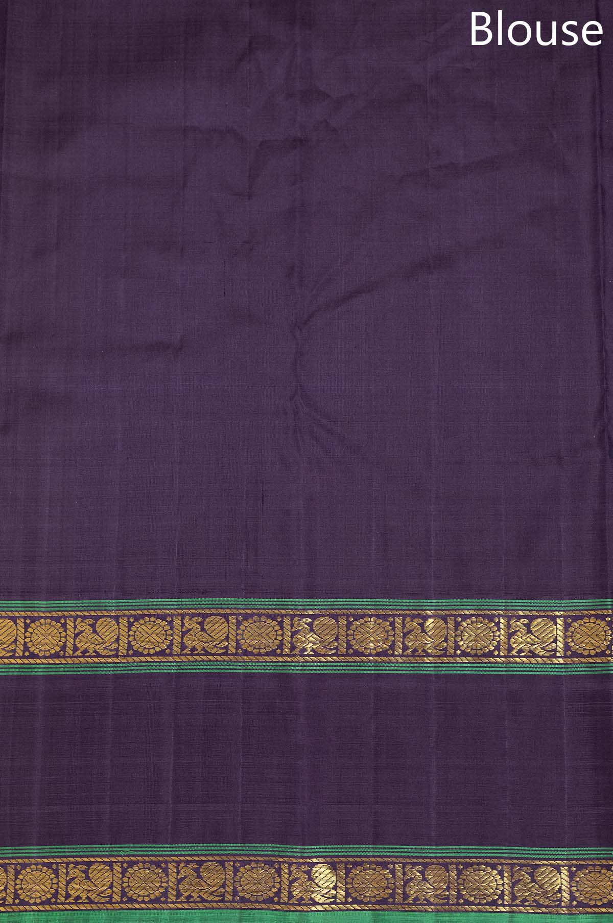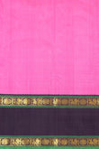 Make a bold fashion statement with this pink and dark brown saree featuring gold zari green stripes, mayil motifs, rudraksha butta, and a green piping border. The plain dark brown blouse complements the saree.