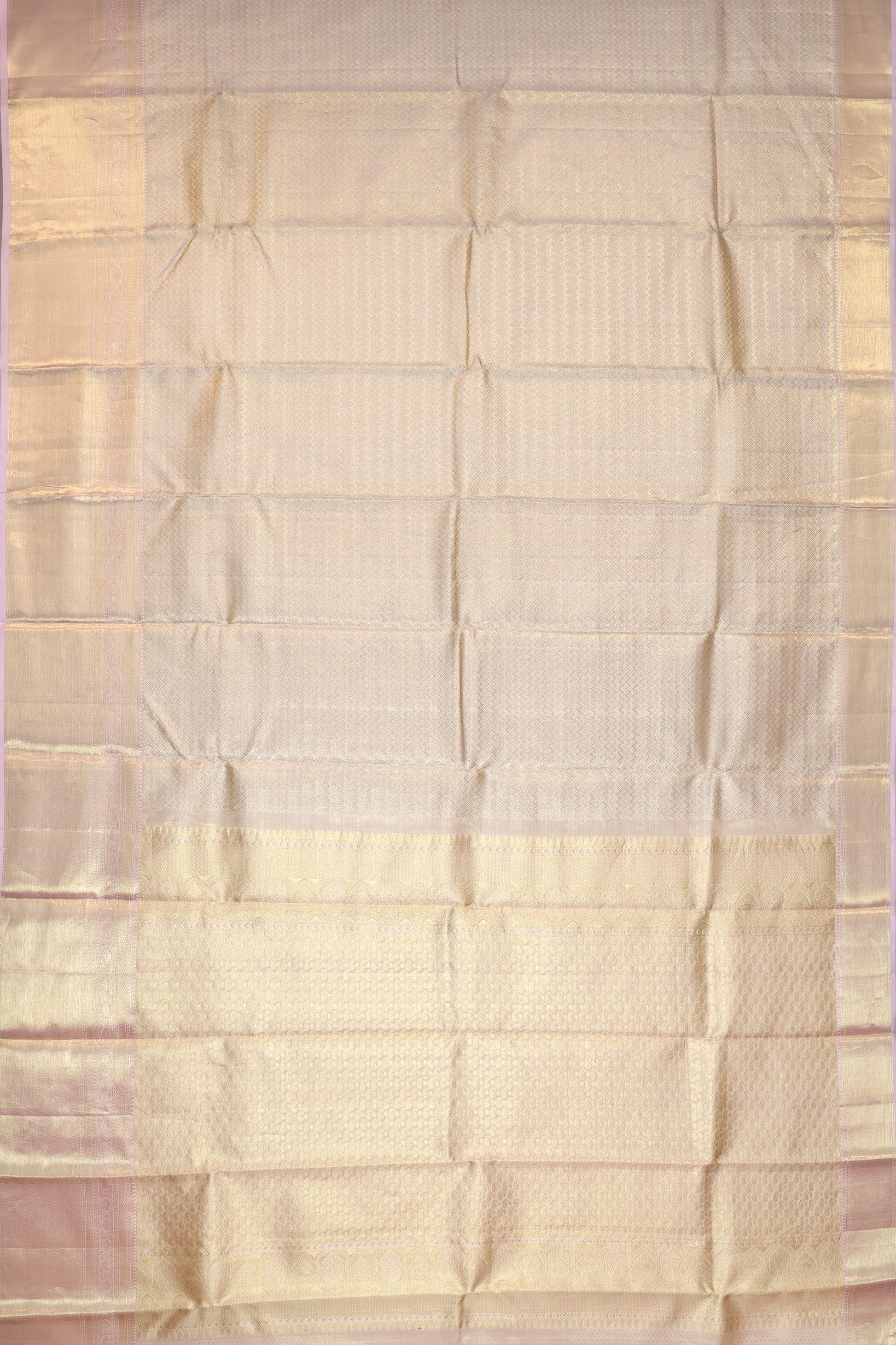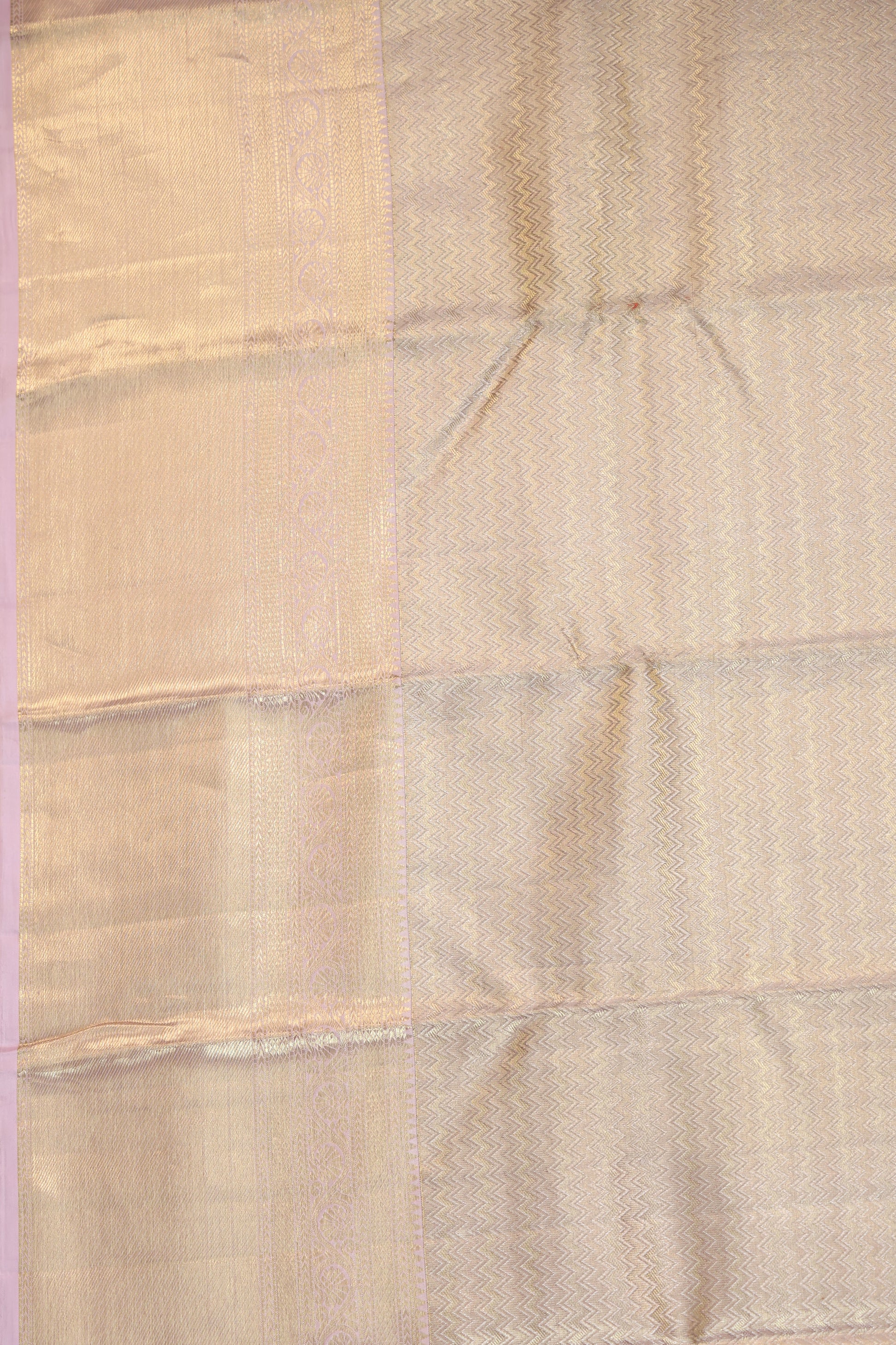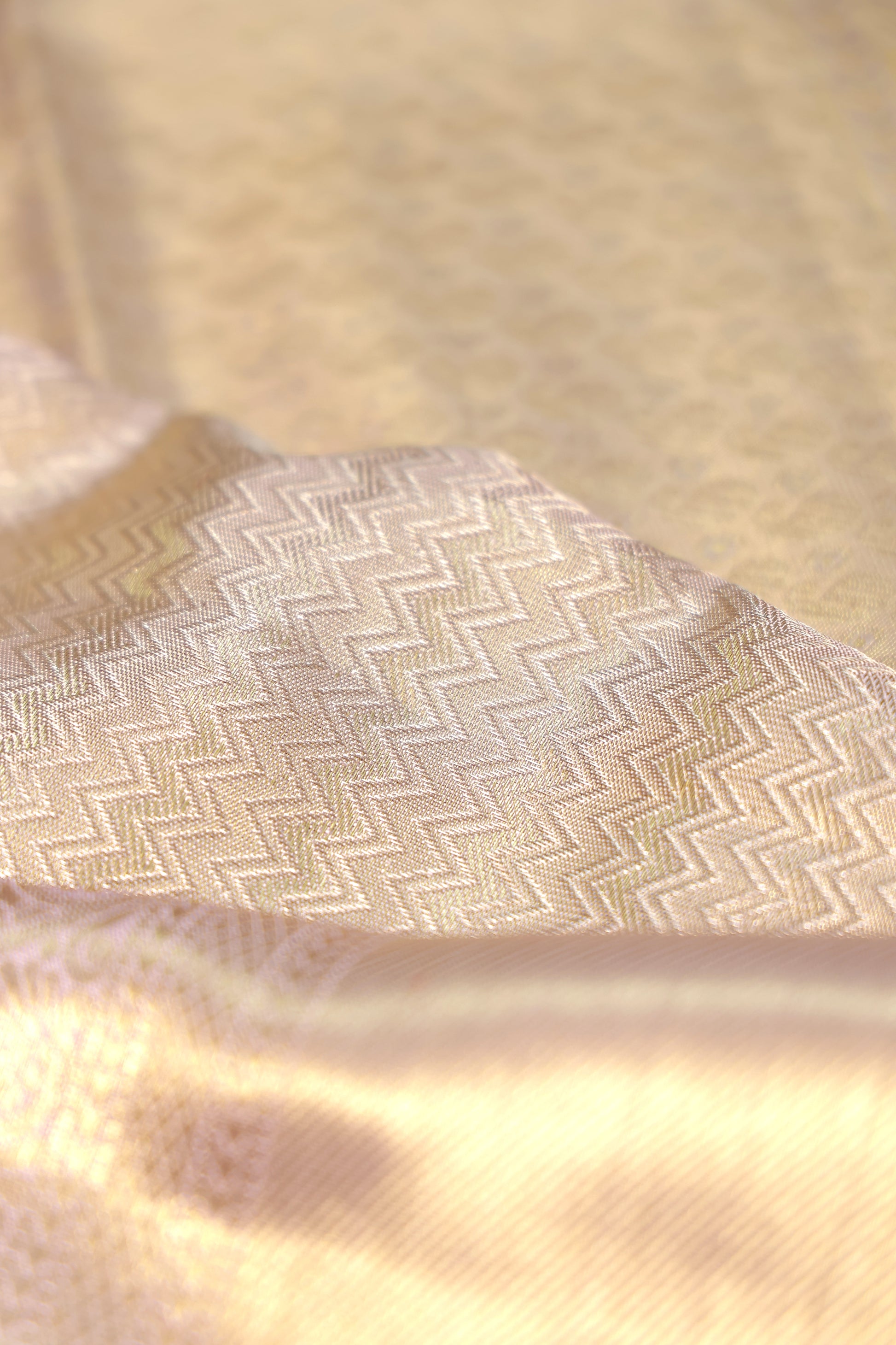Step into festive grace with this pastel pink Kanchipuram tissue silk saree, adorned with all-over chevron patterns and a large self-border. The soft, lustrous silk drape adds a touch of sophistication, making it perfect for weddings and celebrations. A harmonious blend of traditional artistry and contemporary design, this saree radiates timeless charm.