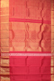 This graceful pink Kanchipuram Silk Saree features a stunning gold zari floral jaal on the body, adding a touch of luxury. The self-colored border is adorned with intricate twill designs, diamond buttas, and leaf patterns. The pallu showcases a checkered design with Rudraksha buttas, chevron patterns, and flower motifs, all in rich gold zari. Paired with a plain pink blouse with a matching border, this saree is perfect for weddings, festive occasions, and traditional celebrations.