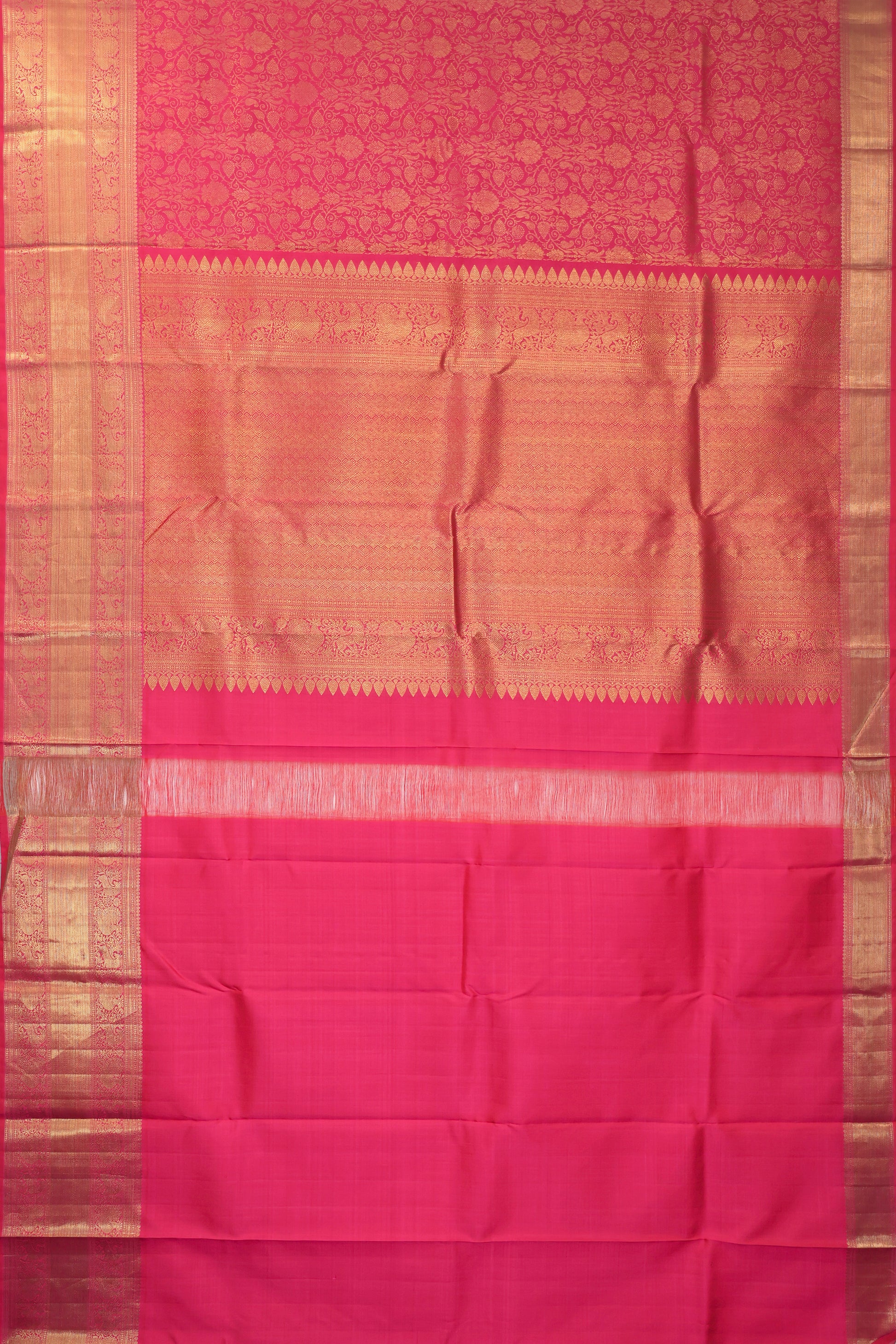 Radiate charm in this Pink Kanchipuram Silk Saree, featuring an all-over gold zari floral jaal on the body. The border is adorned with gold zari, flower designs, mayil (peacock) and kuthurai (parrot) motifs, and kaddi detailing, while the pallu highlights chevron patterns, mayil and kuthurai motifs, leaf designs, and tassels. Comes with a plain pink blouse with border, perfect for weddings and festive occasions.