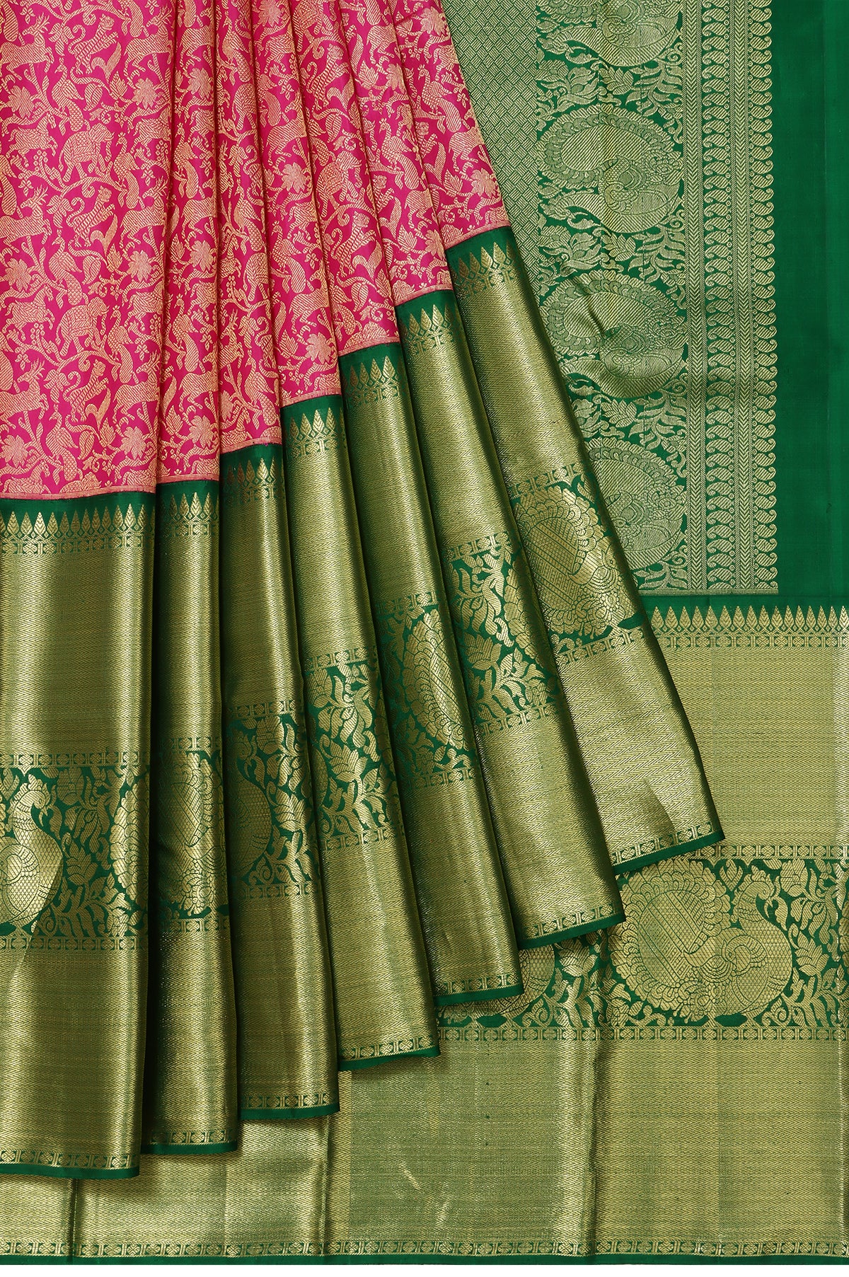 Regal and intricate, this Pink Kanchipuram Silk Saree is exquisitely woven in a Vanasingaram design, featuring a rich jaal of Mayil (peacock), Maan (deer), Yanai (elephant), and Kuthirai (horse) motifs in fine gold zari. The vibrant Green border is adorned with gold zari rudraksha buttas, wave patterns, small leaf motifs, and elegant peacock motifs. Its matching Green pallu continues the grandeur with rudraksha buttas, peacock motifs, and diamond patterns. Paired with a plain Green blouse for a truly timeless, heritage-inspired look.