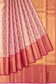 Description: Experience sophistication with our Pink Kanchipuram Tissue Silk Saree. The Dark Pink border shines in Gold Zari, adorned with Diamond and Flower Butta. The self-colored Pallu, enriched with Gold Zari, showcases Leaf and Flower Butta. The saree's body features intricate Silver and Gold Zari, with Leaf Butta and exuding timeless charm.