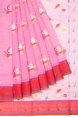 The Pink Kota Doria Silk Saree features a border with red, lavender stripes, and Munia Butta. The Pallu showcases self-color with silver zari, a jaal design, bird motifs, Munia Butta, stripes, and Meenakari work. The body design is adorned with silver zari and charming dollar butta.