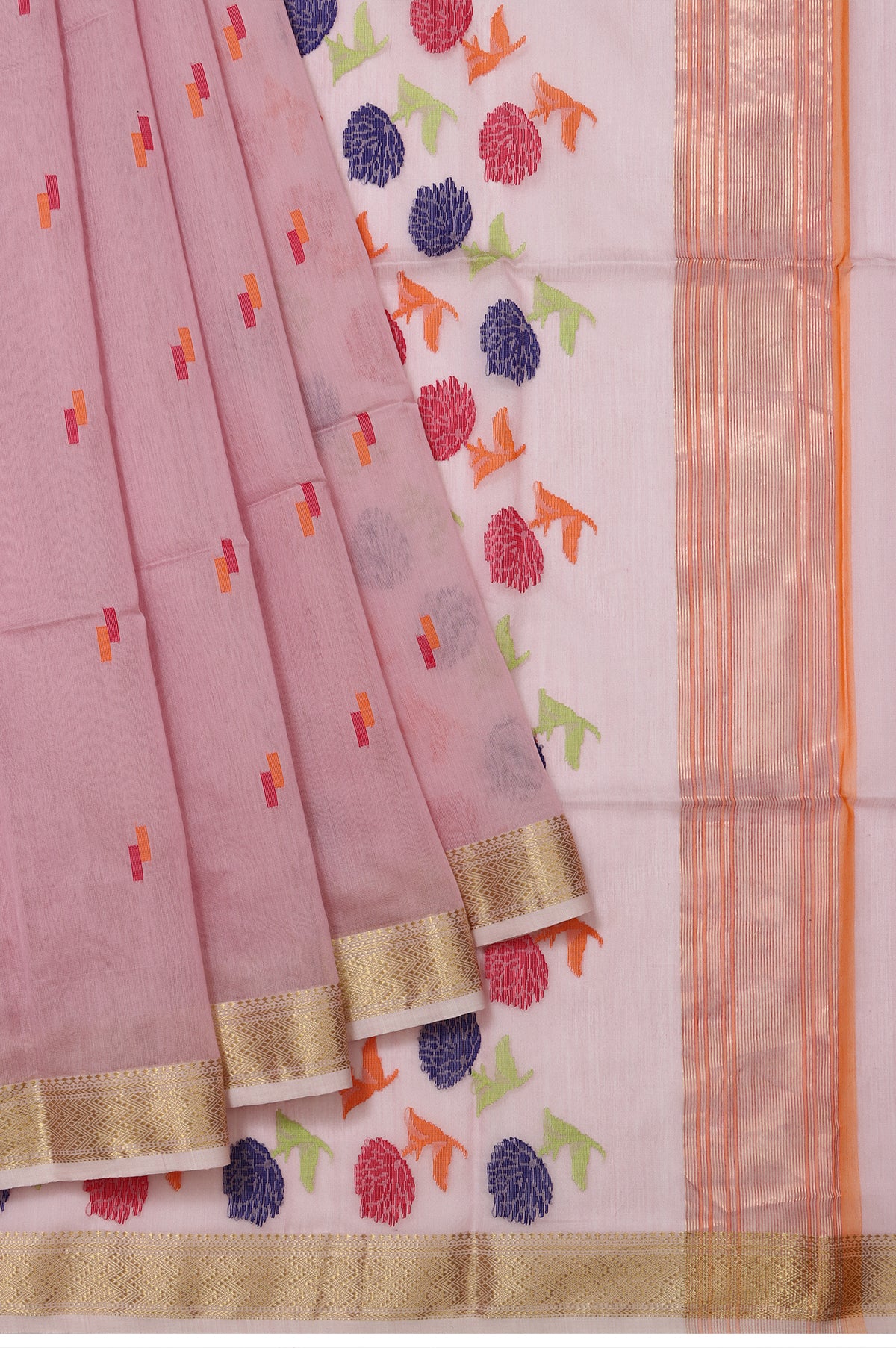 Graceful and timeless, this Pink Maheshwari Silk Saree features delicate thread work buttas that enhance its understated beauty. The self gold zari chevron pattern border with elegant leaf buttas adds a rich, traditional touch. Its pallu is adorned with shimmering gold zari stripes, intricate thread work floral motifs, and tassels. Paired with a self plain blouse with border, perfect for festive and elegant occasions.