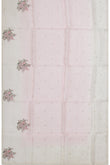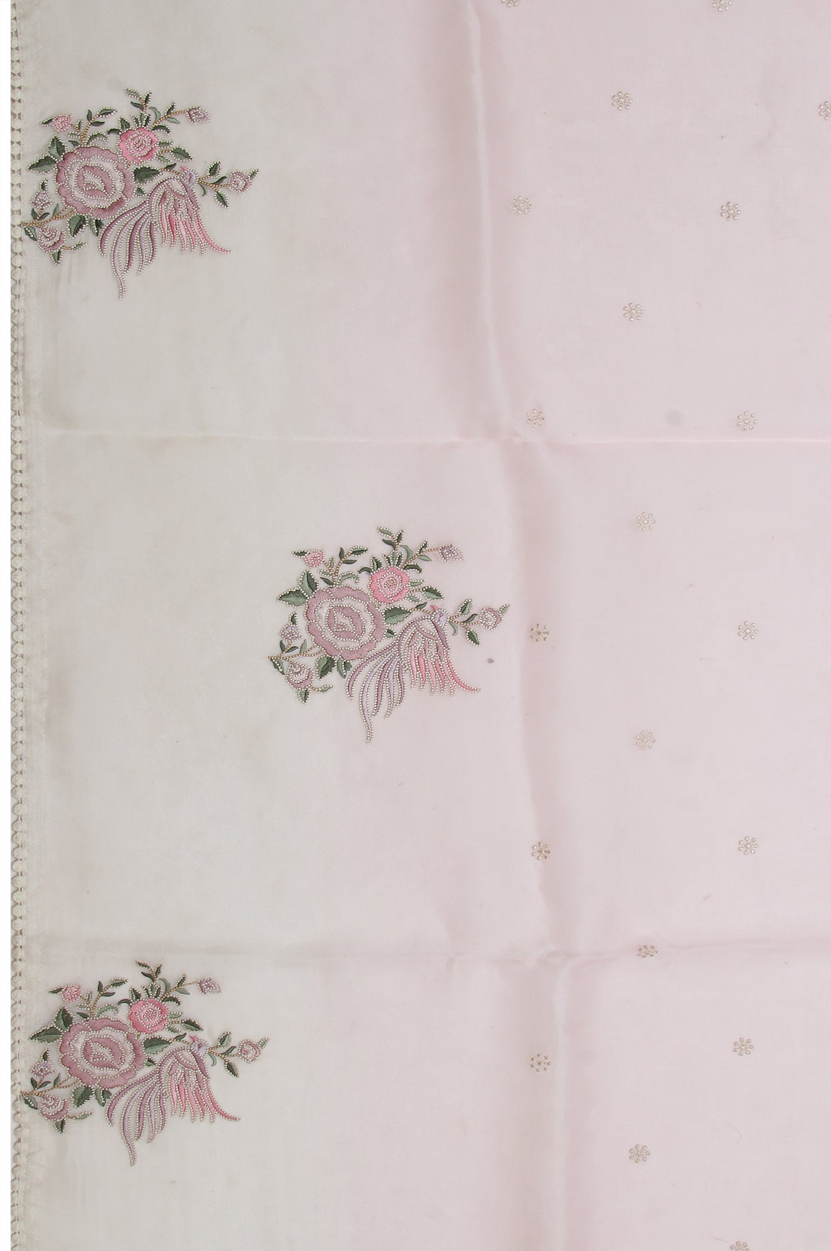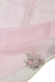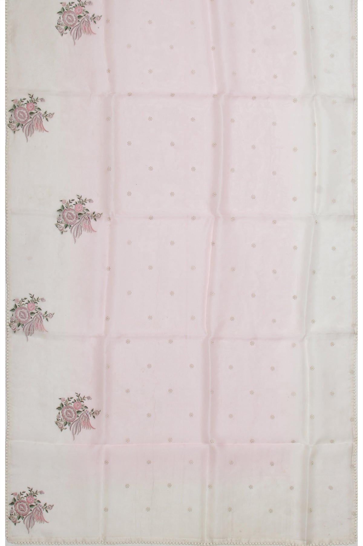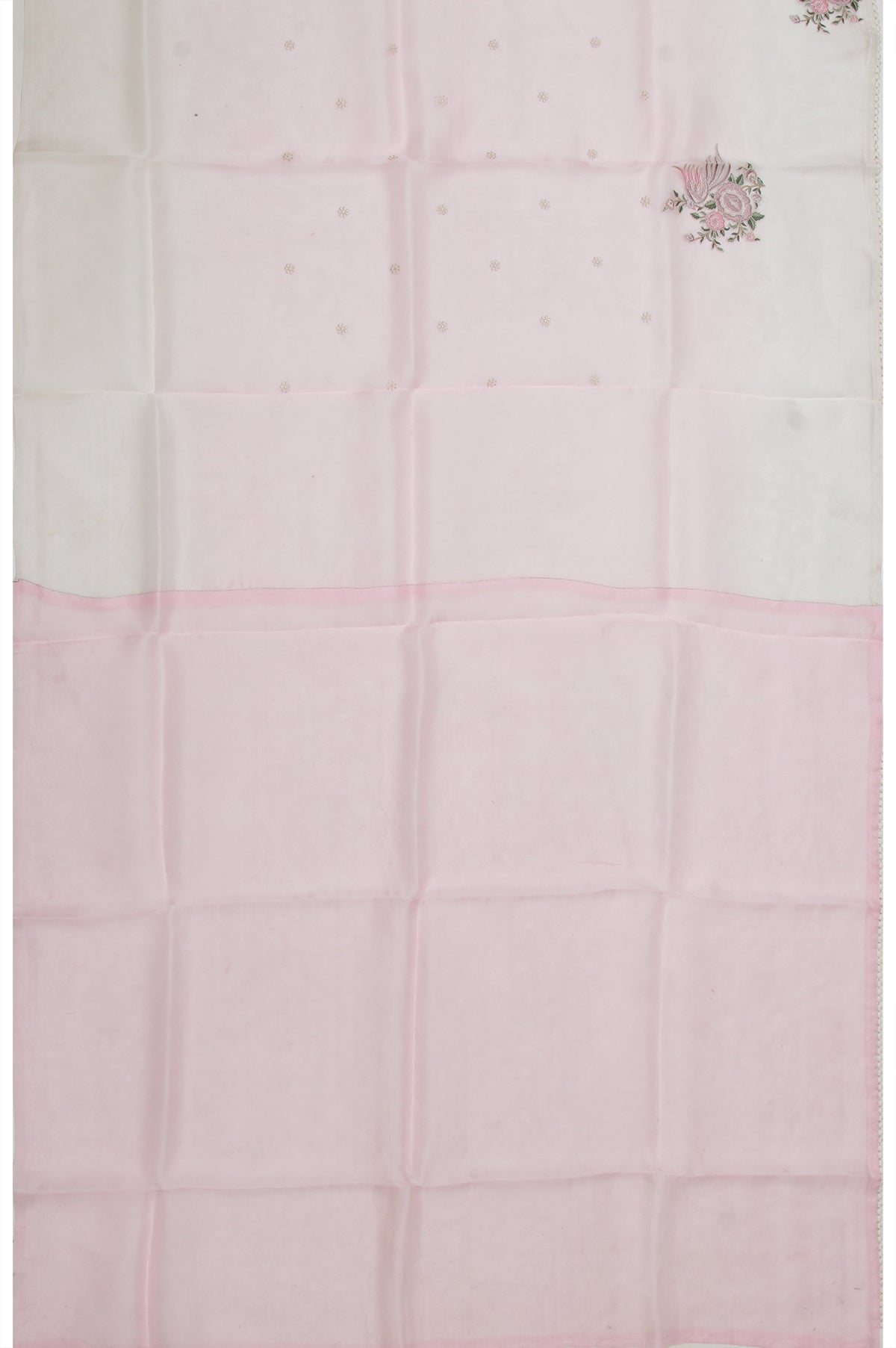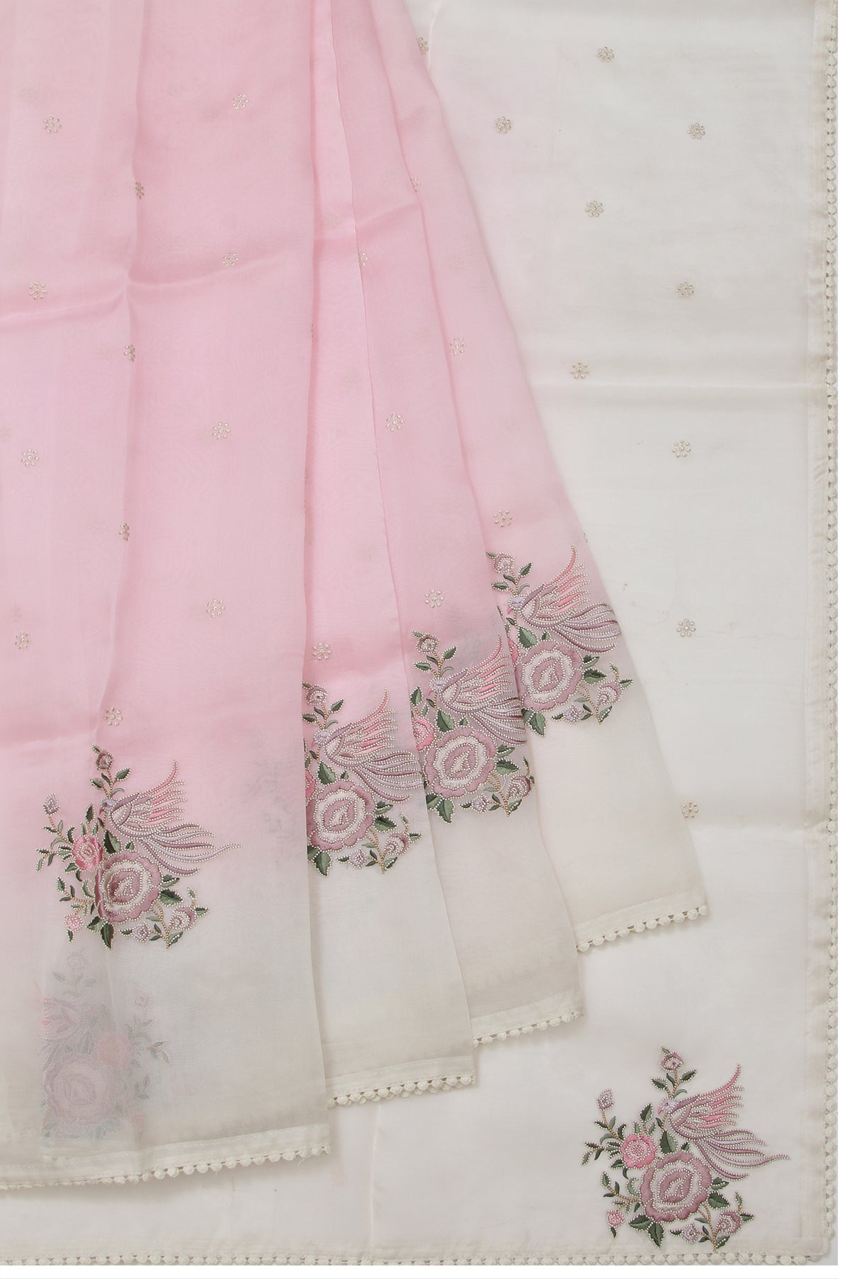 In pink, this Organza Silk Saree is adorned with a self less border and intricate thread flower and bird motifs on the pallu. The body is detailed with thread flower buttas, and the blouse is a self plain piece with a coordinating border, completing the graceful ensemble.