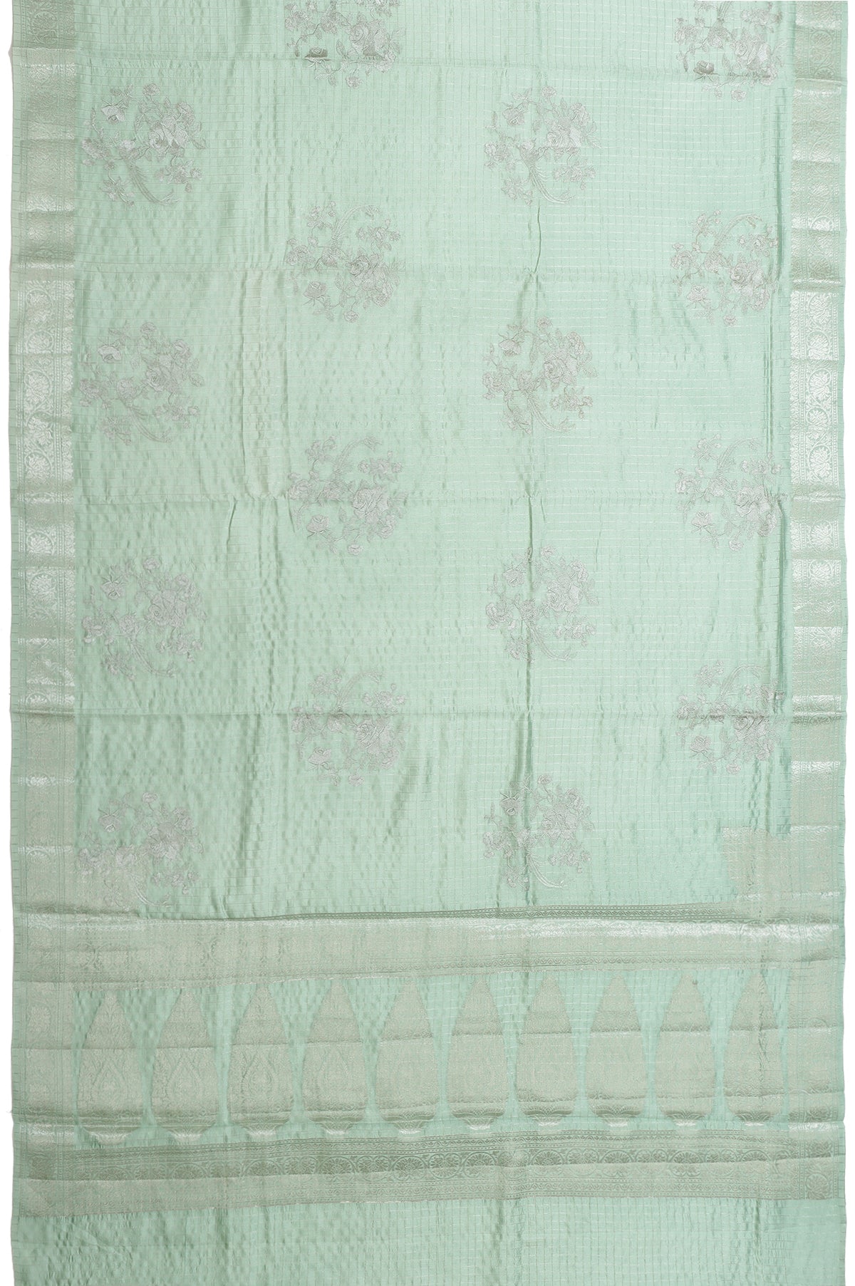 A graceful Pista Green Chiniya Silk saree, beautifully woven with Silver Zari checks and delicate embroidered flower motifs. The self-coloured Silver Zari border is adorned with floral creepers, dot stripes, and charming flower buttas. Its pallu mirrors the border’s elegance, featuring tree and floral motifs. Paired with a Silver Zari-checked plain blouse and matching border, this saree is perfect for elegant festive gatherings and traditional occasions.