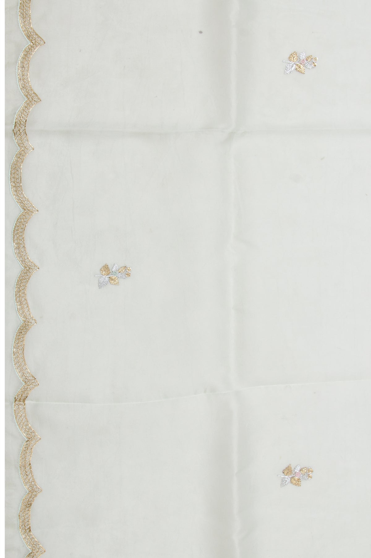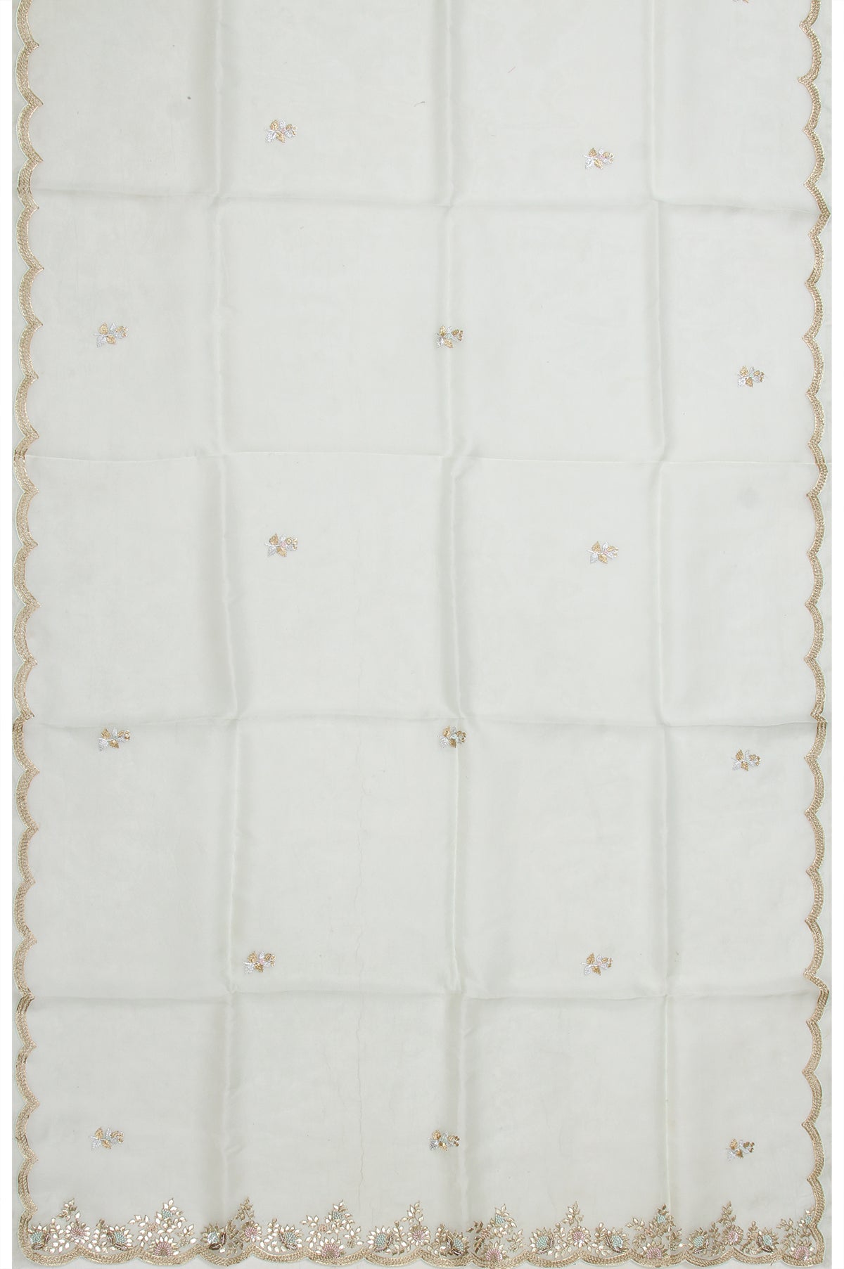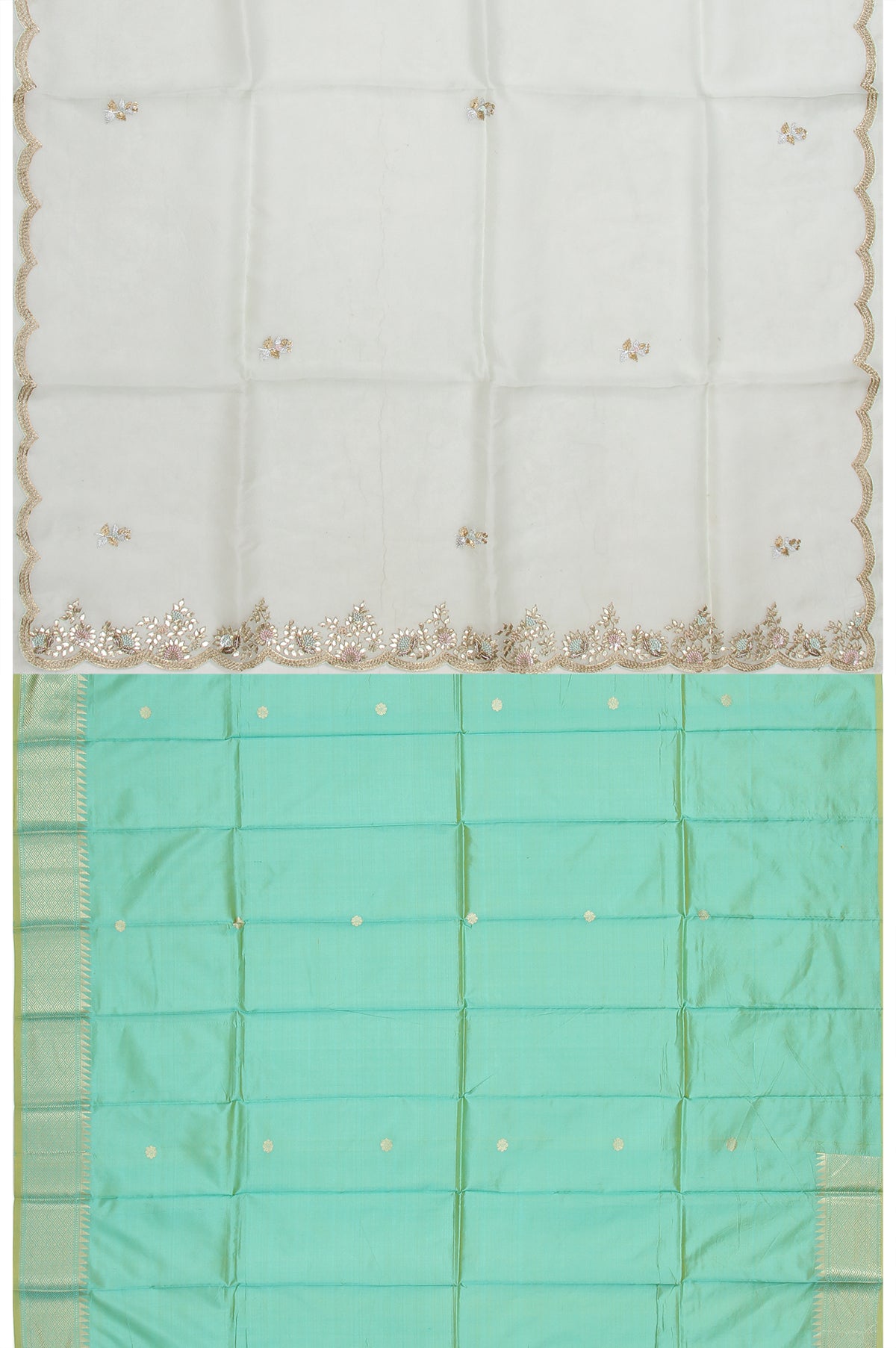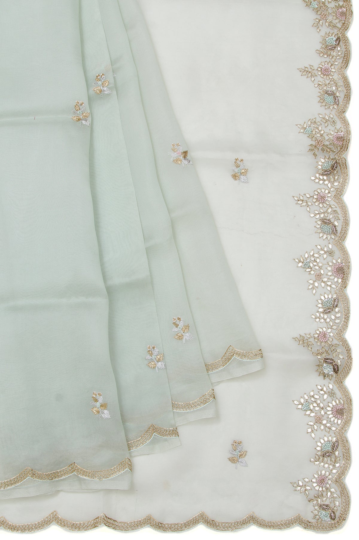 Elevate your ethnic wardrobe with this exquisite Pista Green organza silk saree, featuring a self gold zari embroidery scallop border. The pallu, adorned with gota patti and thread flower embroidery, adds a touch of luxury. The matching sea green blouse, embellished with flower motifs and a temple design, completes this gorgeous ensemble, making it ideal for special celebrations.