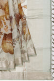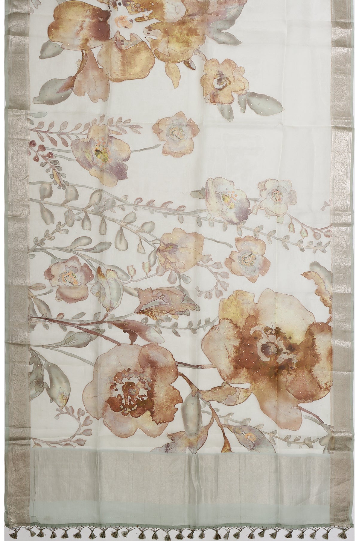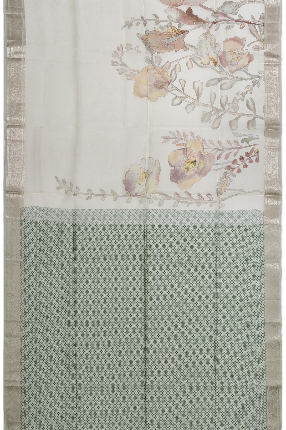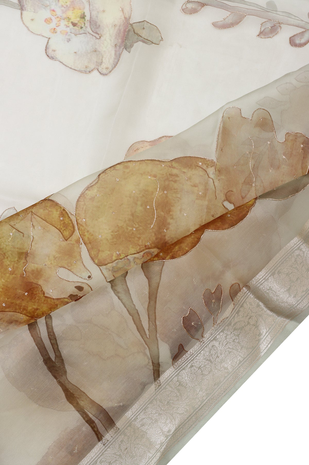 A charming Pista Green Organza Silk saree, featuring delicate tree prints enhanced with fine embroidery. The self-coloured Silver Zari border is adorned with floral creepers, leaf buttas, and subtle stripes. Its pallu is finished with elegant Silver Zari stripes and playful tassels. Paired with a self-printed Chiniya blouse and matching border, this saree is perfect for graceful daytime celebrations and gatherings.
