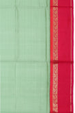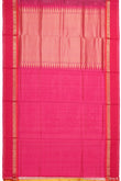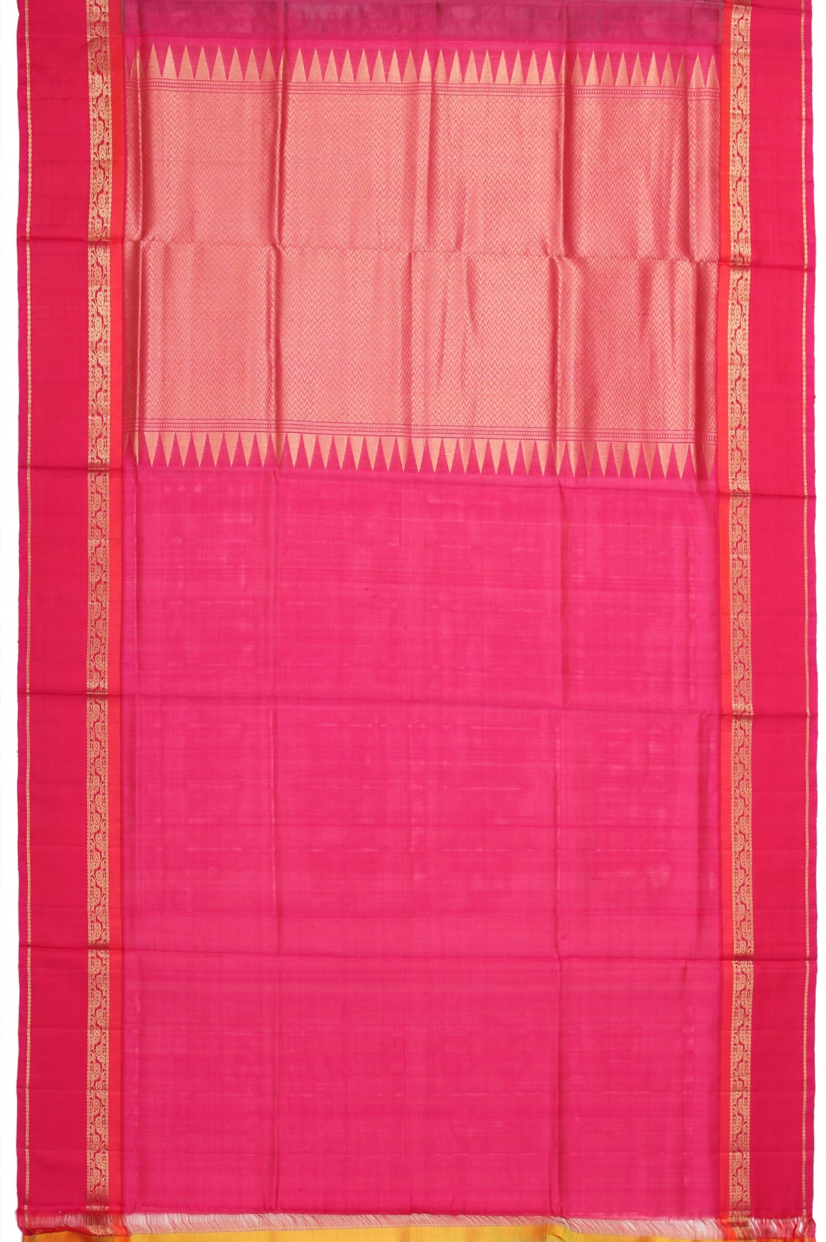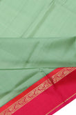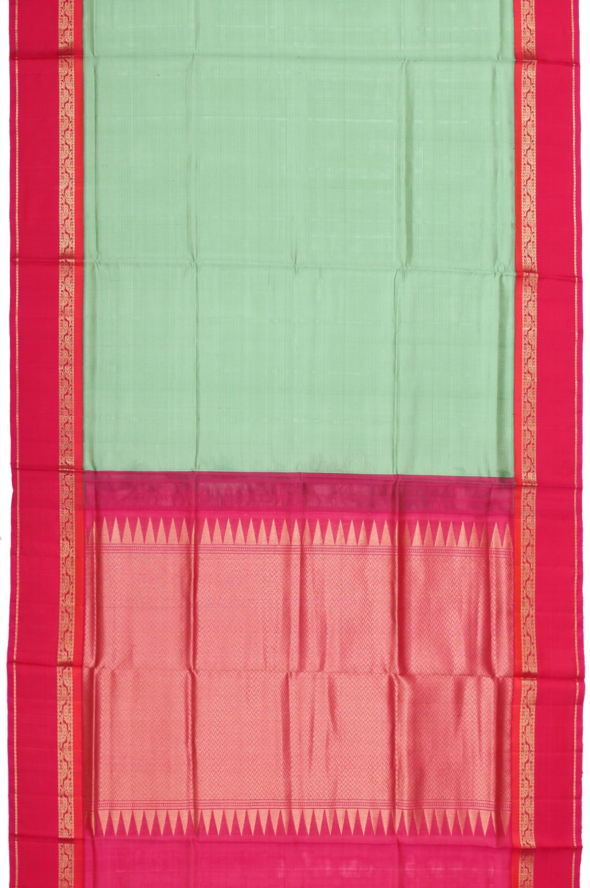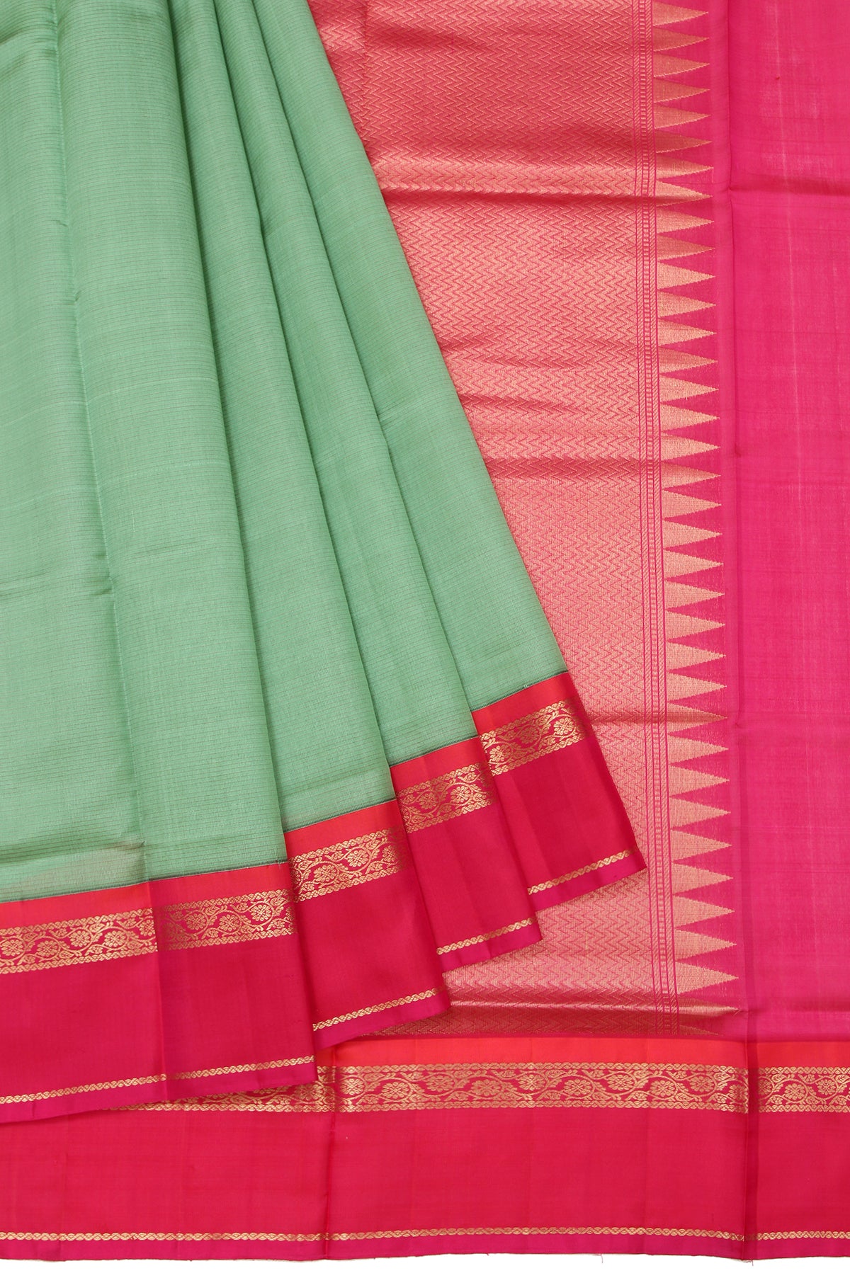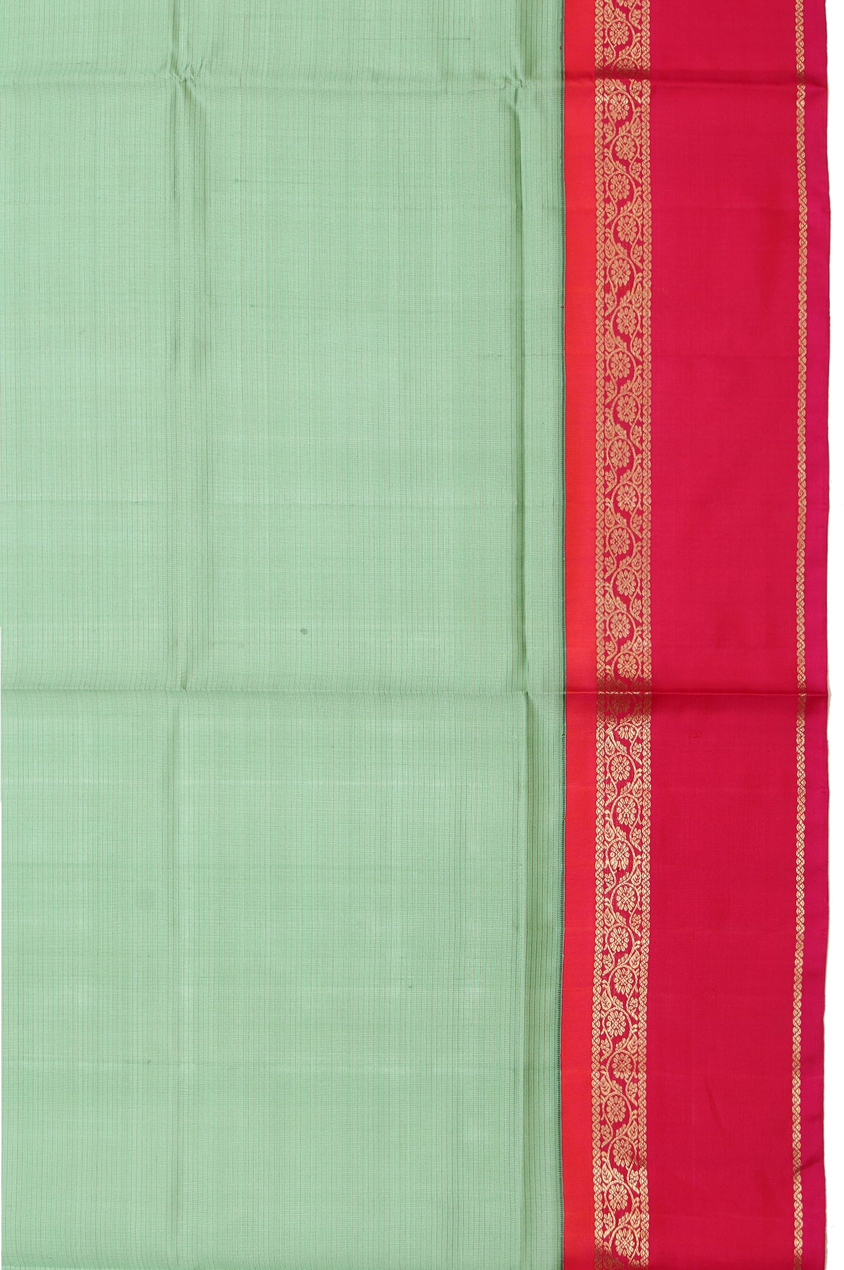 This Pista Green soft silk saree showcases self-stripes on the body with a striking pink and orange kuttu border featuring gold zari floral creeper designs. The pink pallu, decorated with a chevron pattern and temple designs, pairs beautifully with the plain pink blouse.