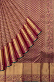 This purple saree is an ode to sophistication. The self-border and pallu celebrate gold zari twill designs, mayil motifs, and a unique green piping border. The body is a canvas for gold zari floral jaal. Paired with a self-embossed blouse adorned with flower buttas and a border, it's a touch of grandeur.