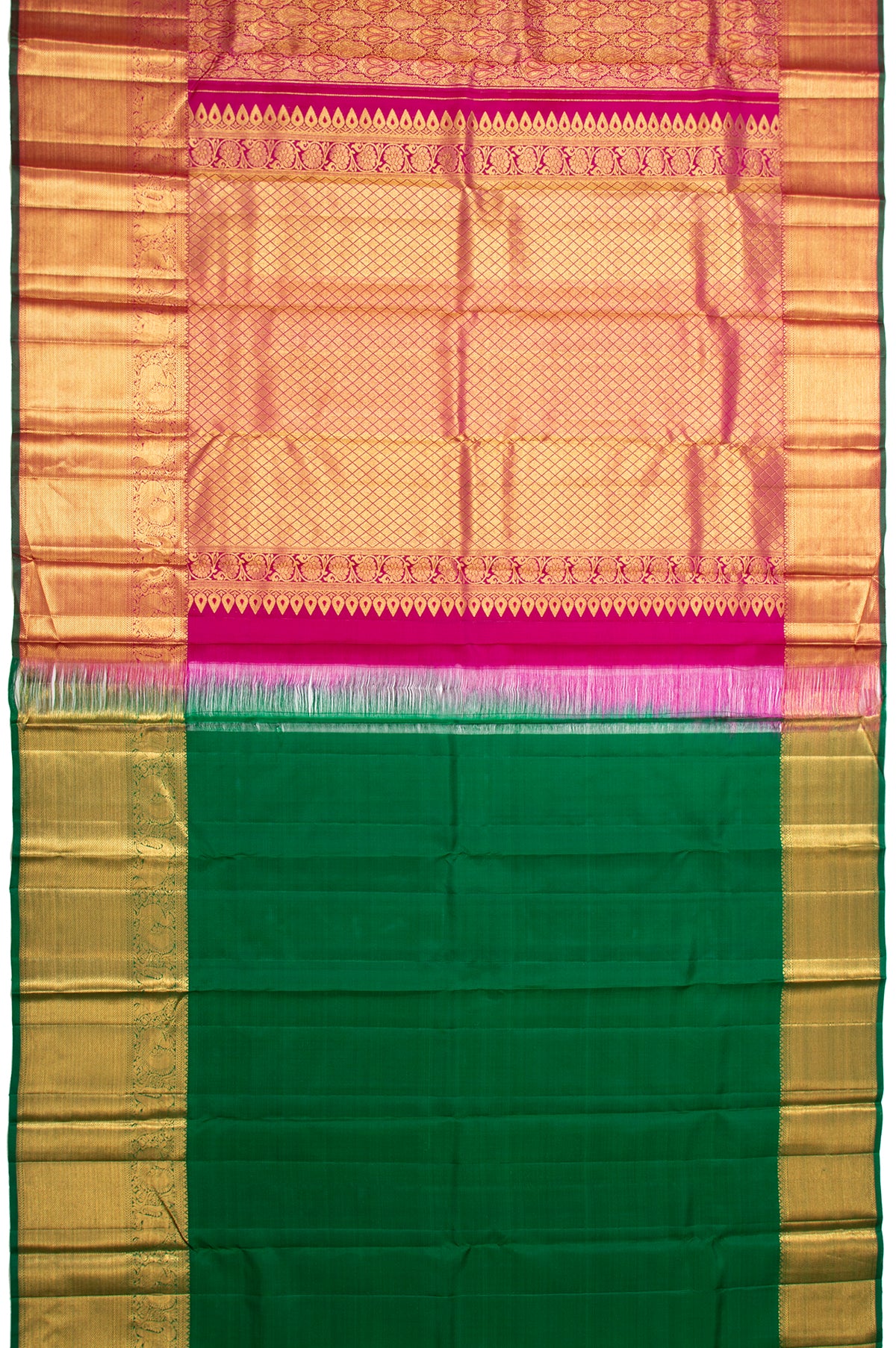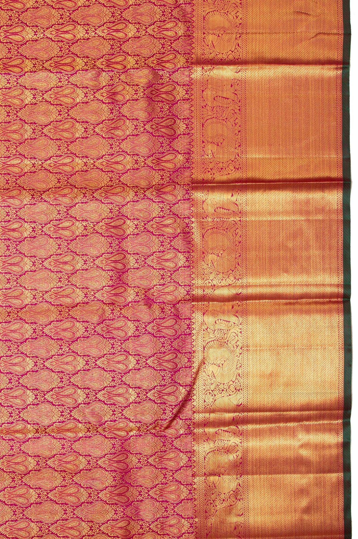 Description - Dive into the opulence of purple Kanchipuram Silk Saree, featuring a self-border with gold zari kaddi design and green selvedge. The gold diamond brocade pallu with floral creeper motifs, paired with a bottle green blouse, tells a story of majestic splendor. This saree is the epitome of regal elegance.
