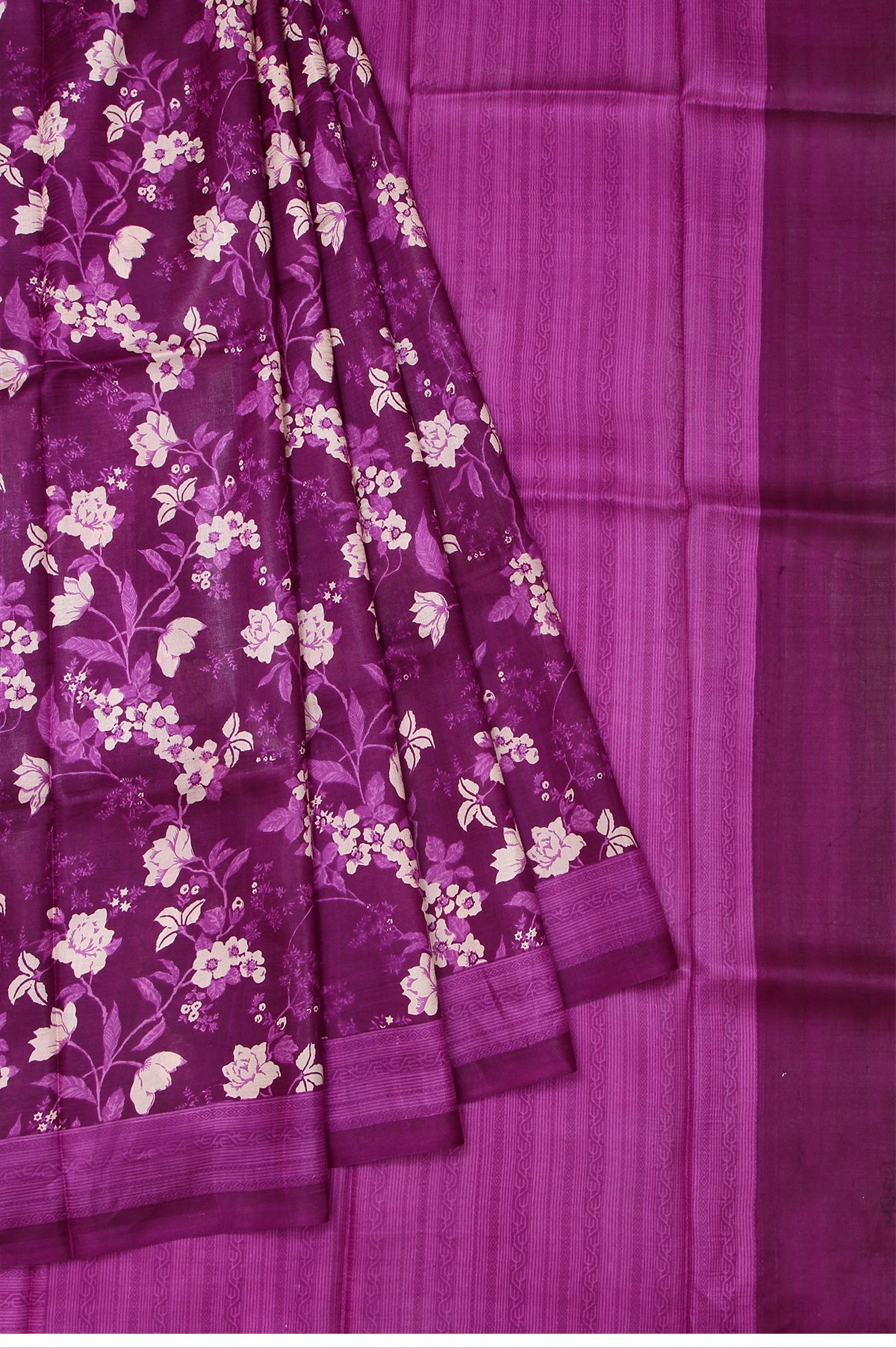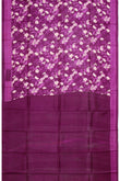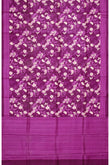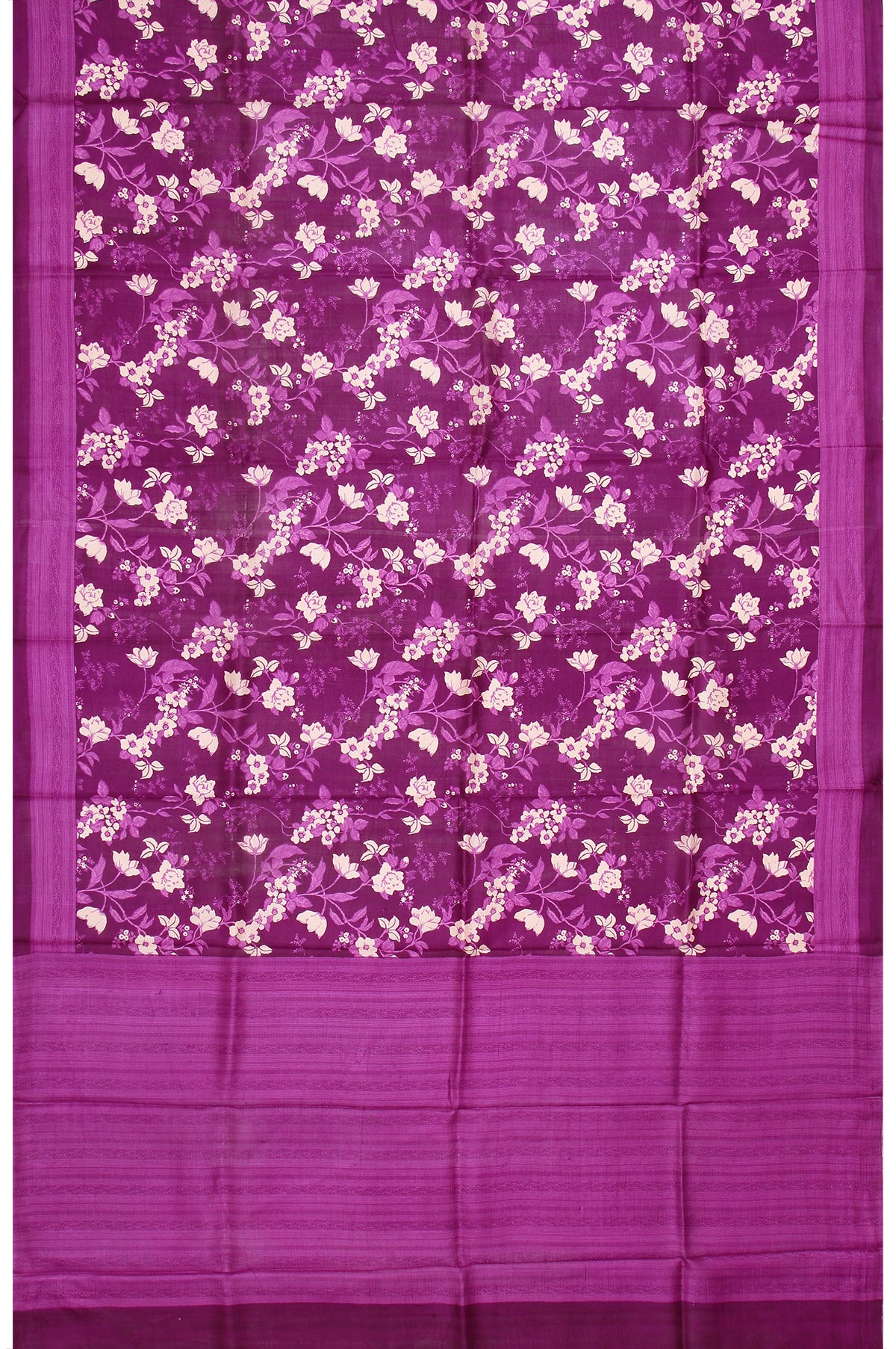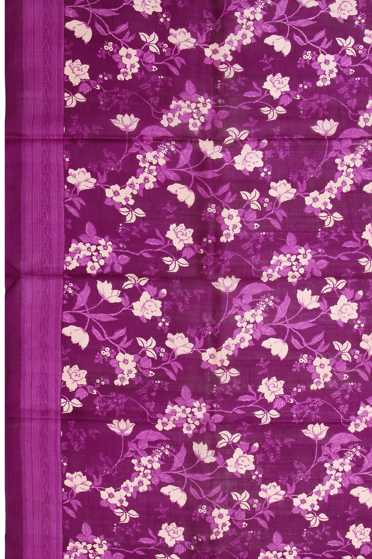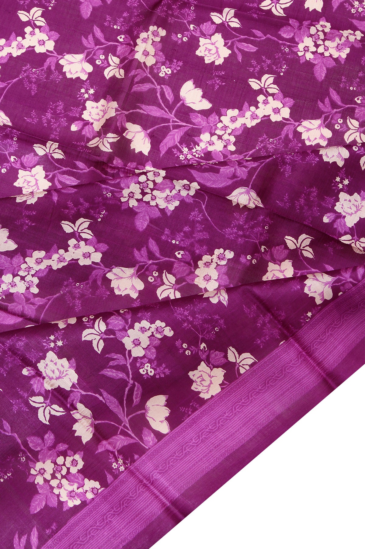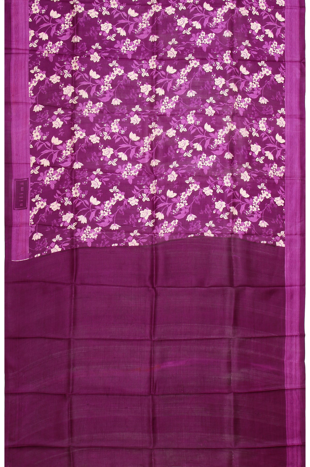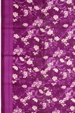 Embrace the essence of elegance with the Purple Pure Silk Saree, a stunning tribute to classic design. The self border features enchanting leaf creeper motifs along with diamond buttas and stripes, adding depth and charm. The pallu carries forward this beautiful theme, creating a harmonious flow. Finished with a plain self blouse, this saree showcases a delicate printed floral jaal on the body, making it an ideal choice for special occasions where you want to shine with sophistication and grace.