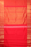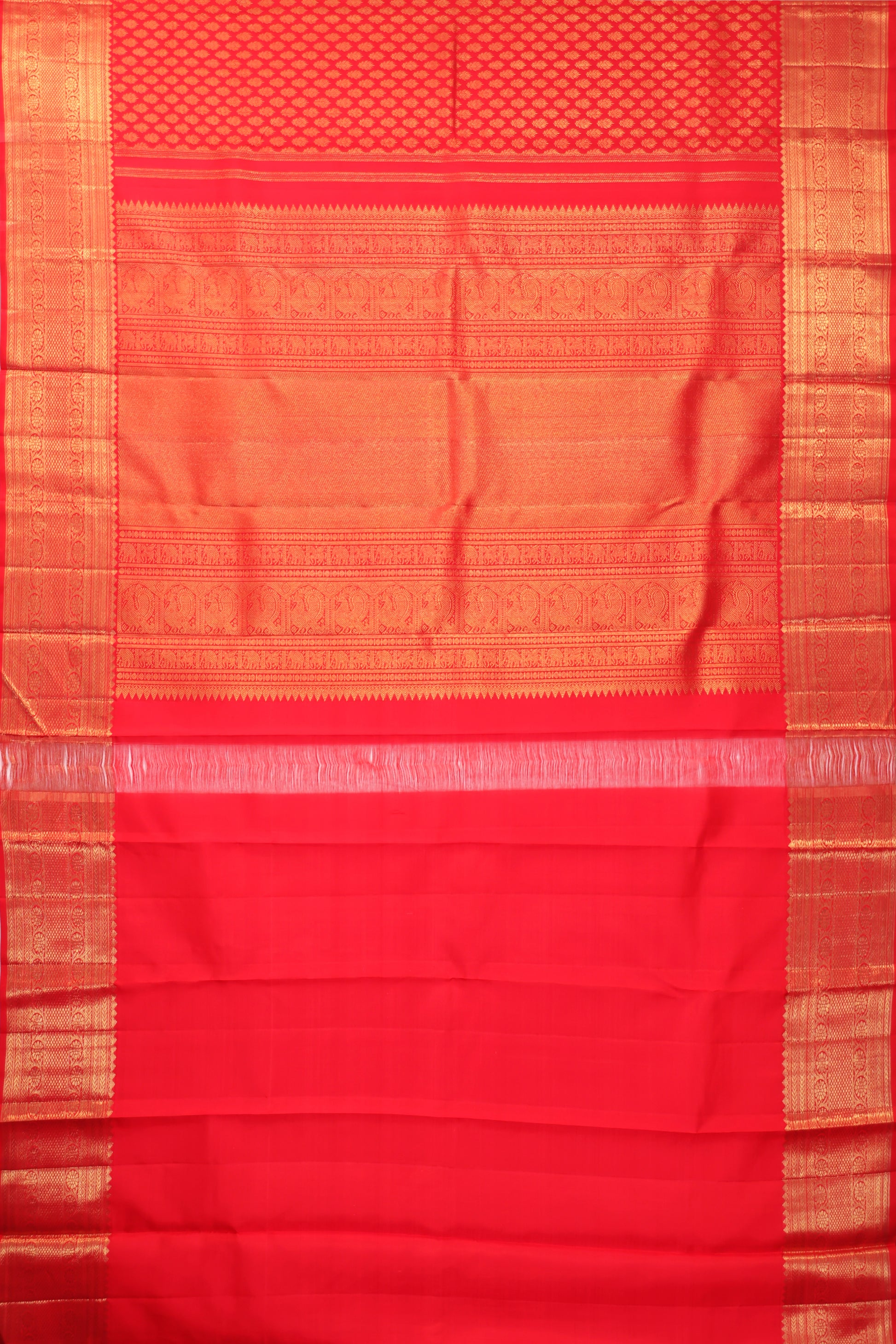 Celebrate tradition with this Red Kanchipuram silk saree, featuring gold zari flower buttas on the body. The self-colored border showcases floral creepers, leaf designs, and diamond checks, while the pallu is adorned with kaddi designs, Yanai, Mayil, Kuthirai motifs, and Rudhraksha buttas. Comes with a matching blouse, perfect for weddings, festivals, and special occasions.